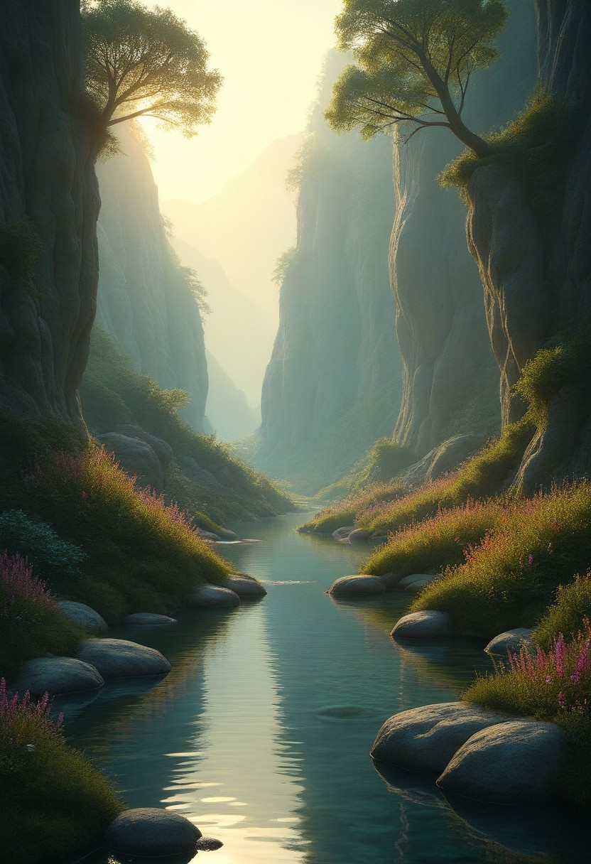A serene fantasy landscape with intricate detail, soft lighting casting a warm glow over rolling hills and dense forests. The mood is peaceful yet magical, from a low-perspective angle that emphasizes vastness and wonder. The setting includes crystal-clear streams and vibrant wildflowers. Textures like smooth stone, detailed plant life, and reflective water surfaces add depth. Genres blend seamlessly into the scene's natural beauty. This prompt ensures a balance of detail and creativity to bring the image to life.