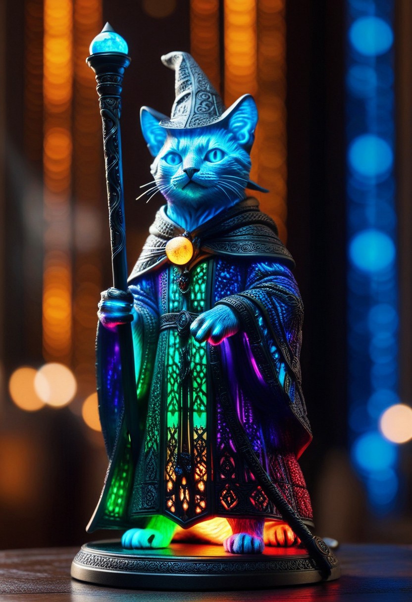 masterpiece,ultra-high resolution,incredible composition,extremely detailed, masterpiece, extremely detailed, sharp outlines, high contrast, fine details, intricate, photo of a sculpture of a RGB themed cat dressed as a wizard, mage robes, staff, made out of RGB themed intricate background, bokeh, inspiring, moody lights, neoclassical art style,