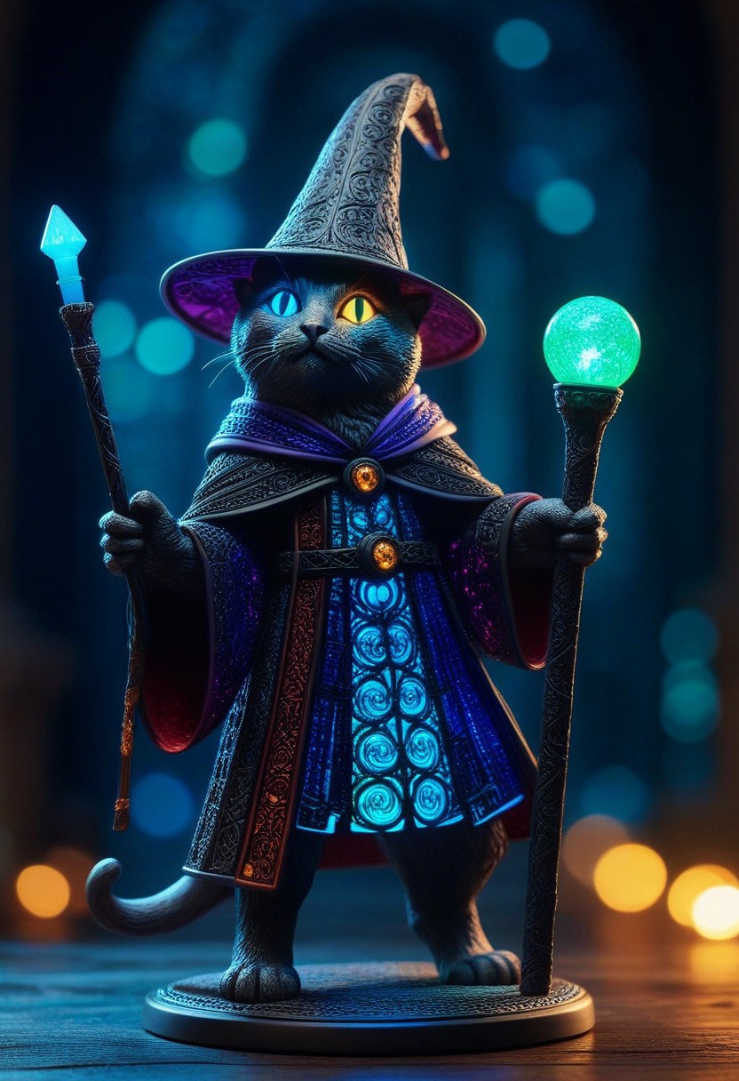 masterpiece,ultra-high resolution,incredible composition,extremely detailed, masterpiece, extremely detailed, sharp outlines, high contrast, fine details, intricate, photo of a sculpture of a RGB themed cat dressed as a wizard, mage robes, staff, made out of RGB themed intricate background, bokeh, inspiring, moody lights, neoclassical art style,