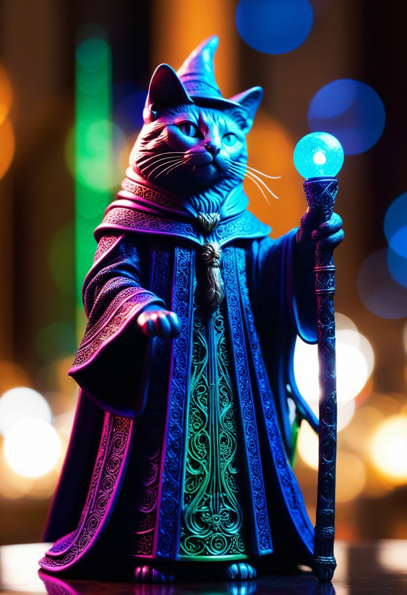 masterpiece,ultra-high resolution,incredible composition,extremely detailed, masterpiece, extremely detailed, sharp outlines, high contrast, fine details, intricate, photo of a sculpture of a RGB themed cat dressed as a wizard, mage robes, staff, made out of RGB themed intricate background, bokeh, inspiring, moody lights, neoclassical art style,