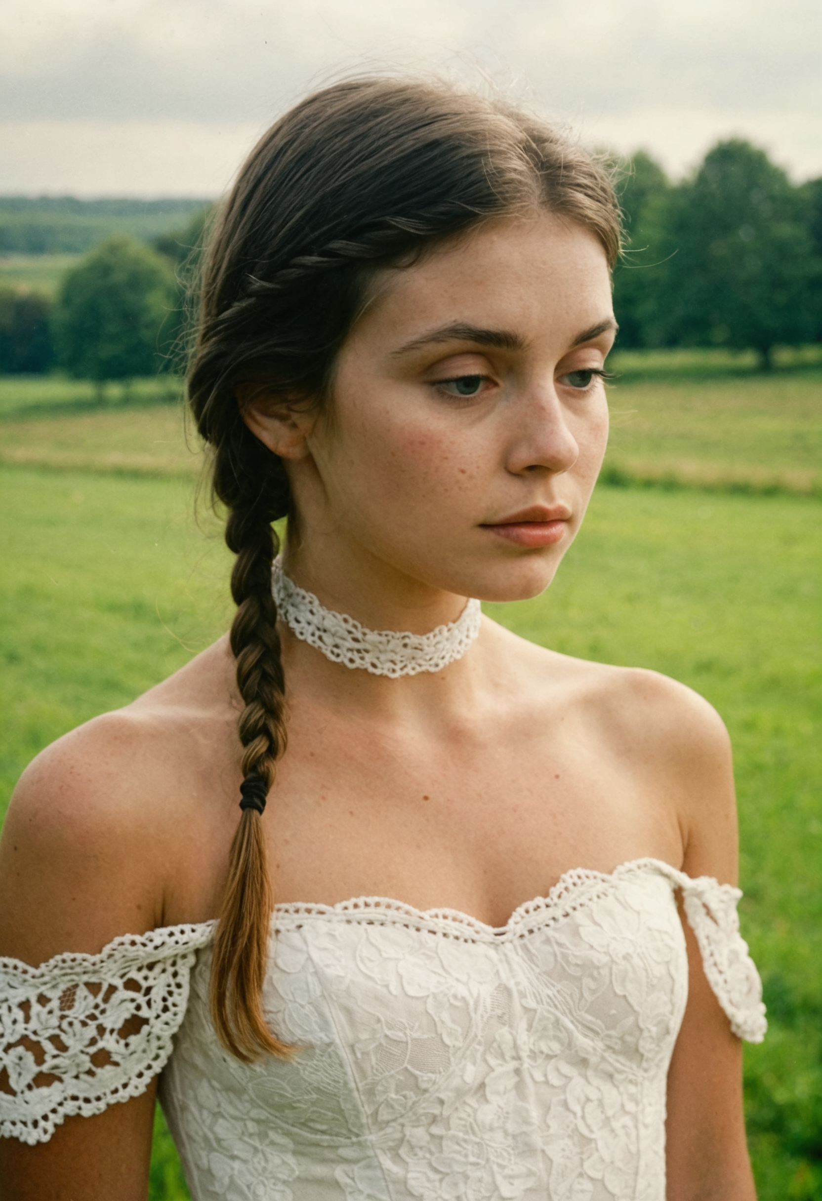 portrait, masterpiece, 4k, ray tracing, intricate details, highly-detailed, hyper-realistic, 8k RAW Editorial Photo. The image is a high-resolution photograph featuring a young woman standing outdoors against a blurred rural landscape. The subject is positioned centrally in the frame, facing the camera with a neutral expression. She has fair skin and her brown hair is styled in a delicate side braid, with loose strands framing her face. Her makeup is minimal, emphasizing her natural beauty. She wears a sleeveless, off-the-shoulder white gown adorned with intricate floral lace detailing, which extends to her upper arms. The lace adds a touch of elegance and femininity to the dress. The neckline is high, and she wears a thin, white choker around her neck. The background features a lush, green field with scattered trees, providing a serene and natural setting. The sky is overcast, casting a soft, diffused light over the scene, enhancing the softness of the image. The photograph captures a blend of classic and contemporary styles, with a focus on the subject's delicate beauty and the tranquil countryside as the backdrop. <lora:epiCRealnessRC1:1> cinematic light, dramatic light, shallow depth of field, high budget, bokeh, cinemascope, film grain ISO 200 faded film, 35mm photo, grainy, vignette, vintage, Kodachrome, Lomography, stained, highly detailed, found footage