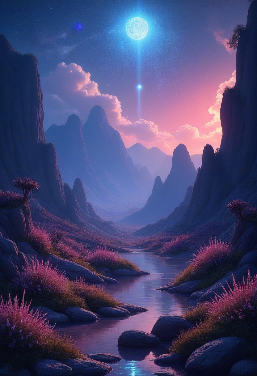 A serene fantasy landscape. Bioluminescent plants speckle this almost barren land. Distant crooked mountains give a pristine skyline which opens up to the neighboring planets shimmering in the night sky. A few fluffy clouds appear in what is otherwise a crystal-clear night sky.