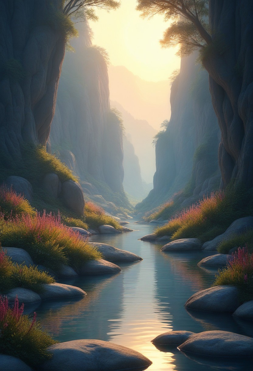 A serene fantasy landscape with intricate detail, soft lighting casting a warm glow over rolling hills and dense forests. The mood is peaceful yet magical, from a low-perspective angle that emphasizes vastness and wonder. The setting includes crystal-clear streams and vibrant wildflowers. Textures like smooth stone, detailed plant life, and reflective water surfaces add depth. Genres blend seamlessly into the scene's natural beauty. This prompt ensures a balance of detail and creativity to bring the image to life.