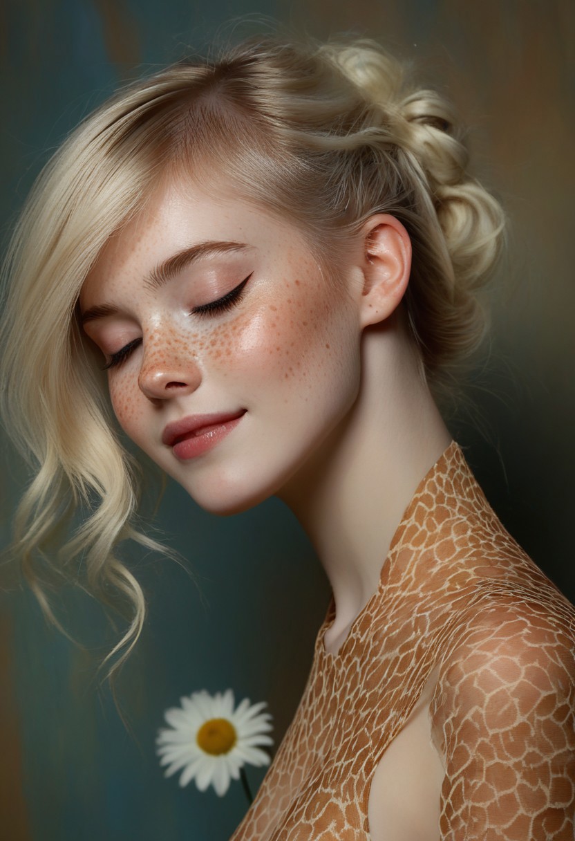 This is a highly detailed, UHD photograph featuring a surreal, stylized portrait of a young woman with an ethereal, almost otherworldly appearance. The subject has porcelain skin with a delicate, freckled complexion and striking, closed eyes, giving an impression of serene tranquility. Her hair is a striking, platinum blonde, styled in a voluminous, slightly messy updo with a few strands framing her face. A large, white daisy is tucked behind her ear, adding a touch of natural beauty to the surreal scene. Her skin is adorned with a unique, intricate pattern of golden-brown, giraffe-like spots, which extend from her neck to her shoulders, blending seamlessly with her skin texture. The contrast between her pale skin and the warm, earthy spots creates a striking visual effect. she's sitting with the side view and with one leg up and other extended behind her Her lips are painted a soft, muted pink, and her expression is serene, with a subtle, almost imperceptible smile. The background is a deep, rich brown, which contrasts sharply with her light hair and skin, drawing attention to her face and the intricate pattern on her neck. The lighting is soft and warm, casting subtle shadows that enhance the texture and depth of her skin and the spots.