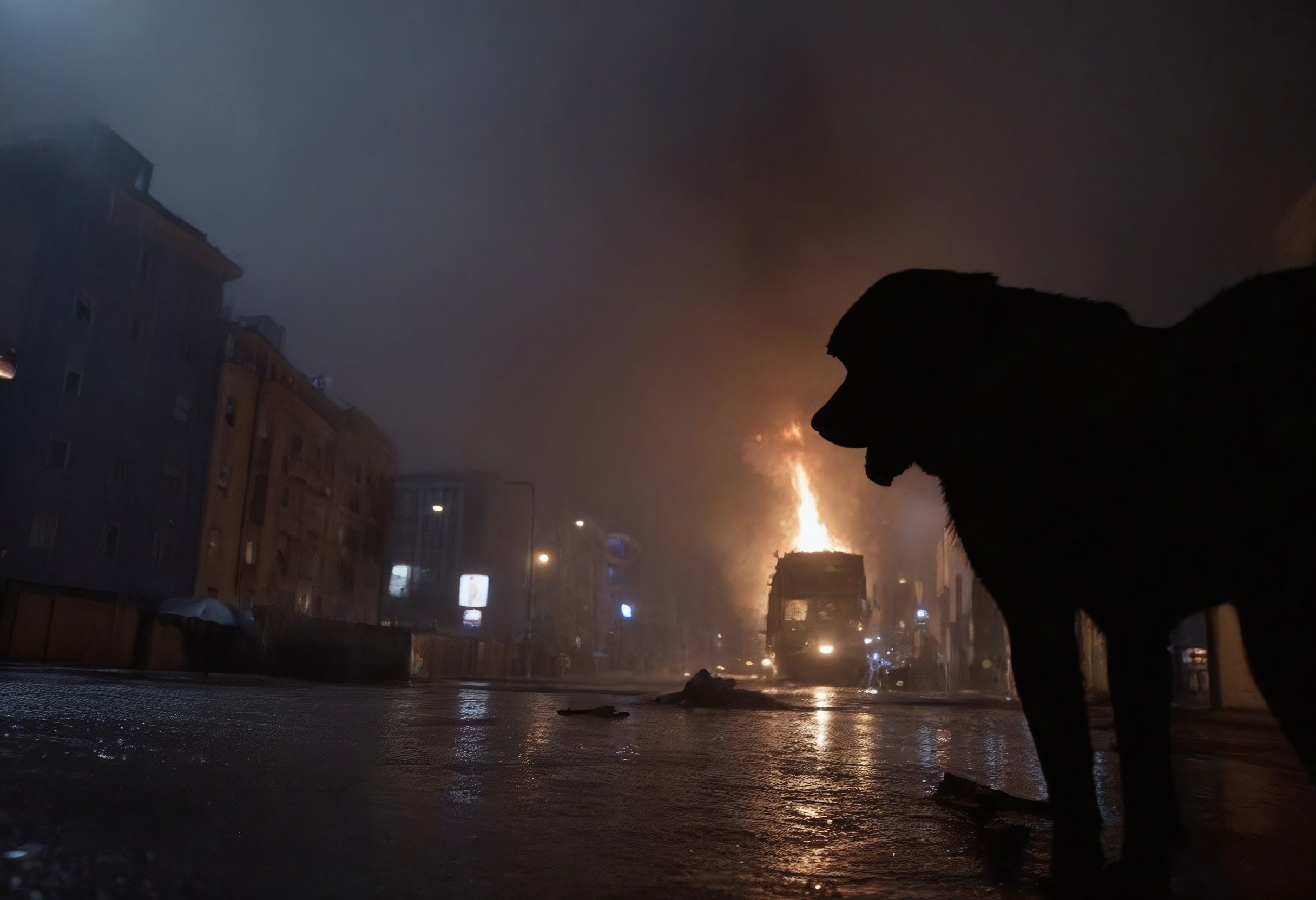 filmed from the ground on a streat in a city. it is late night and raining. burning buildings and a giant dark dog in the background. like from a horror movie.