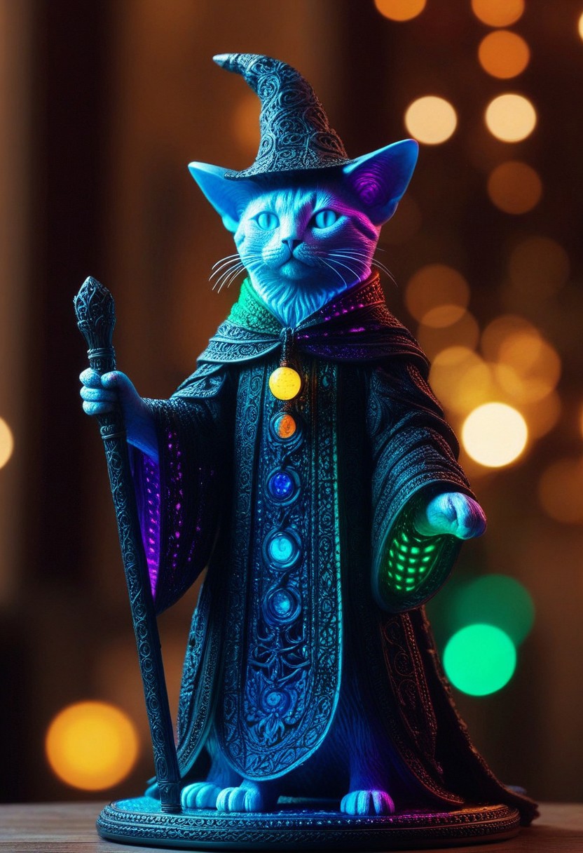 masterpiece,ultra-high resolution,incredible composition,extremely detailed, masterpiece, extremely detailed, sharp outlines, high contrast, fine details, intricate, photo of a sculpture of a RGB themed cat dressed as a wizard, mage robes, staff, made out of RGB themed intricate background, bokeh, inspiring, moody lights, neoclassical art style,