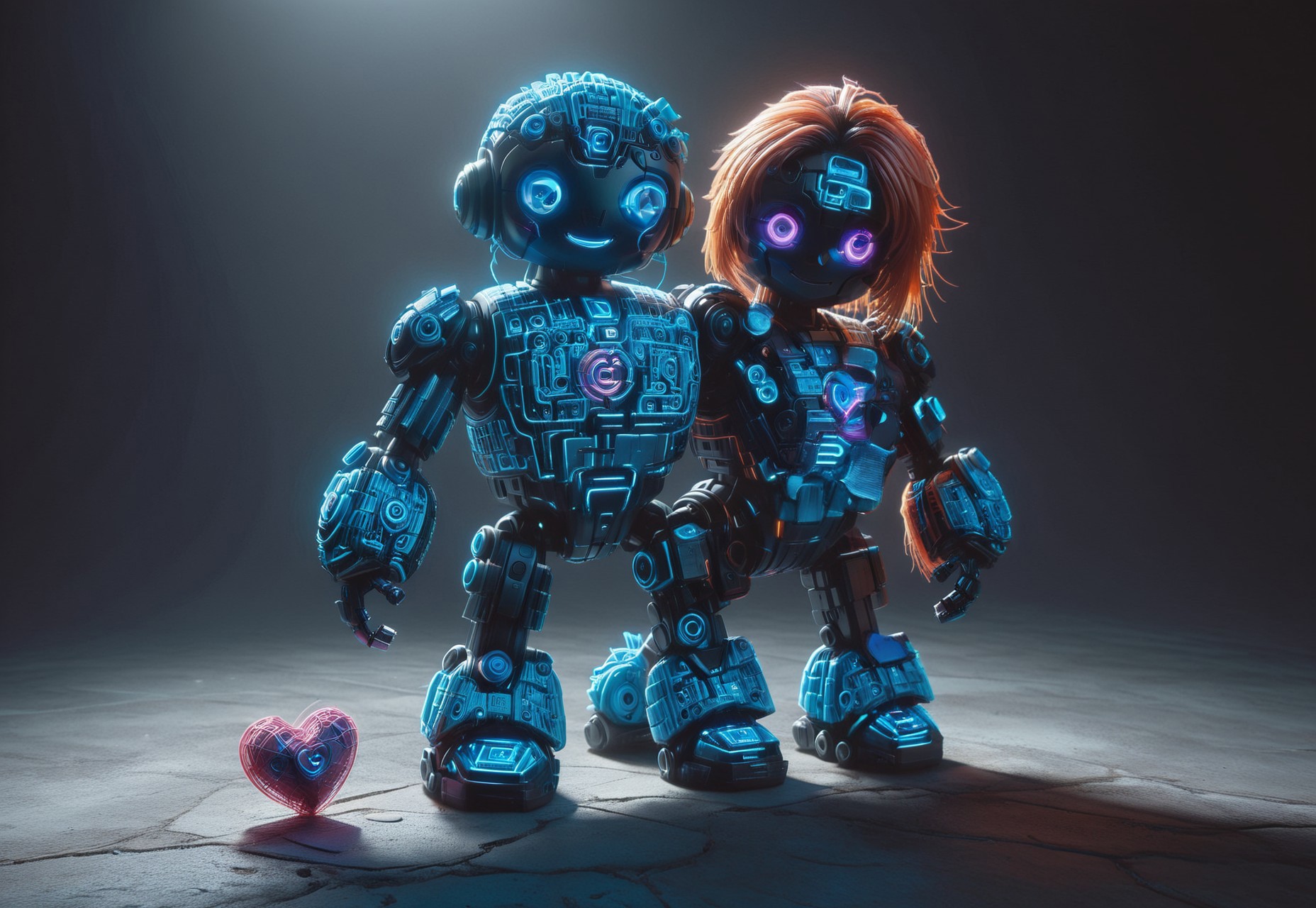 (3 diffrents characters:2), best quality, good quality, very awa, very aesthetic, absurdres, newest, group, group shot, expressing love, hugging, CivBot, CivChan and civitchan holding together, 3 people hugging together, 2girls, and 1robot, (Ombre color scheme of neon blue,neon light orange ,neon orange ) made of, tiny neon glass filaments, w0gf1l:0.81, Manga style, detailed hyperrealism, full-body automaton (CivBot, blue robot), Civitai Logo medallion, head tilted, very high contrast, overhead lighting, 3D rendering, 4, smiling, holographic text:"BUZZ" coins floating around, First character : CivChan, purple eyes, pink hair made of filaments, short hair, made of ral-smlvltnpls, Second character : CivBot, civitchan, blue yes, black long hair made of filaments, body made of filaments, made of ral-smlvltnpls, Third character : android, bot, made of ral-smlvltnpls, Background:cyber bedroom,