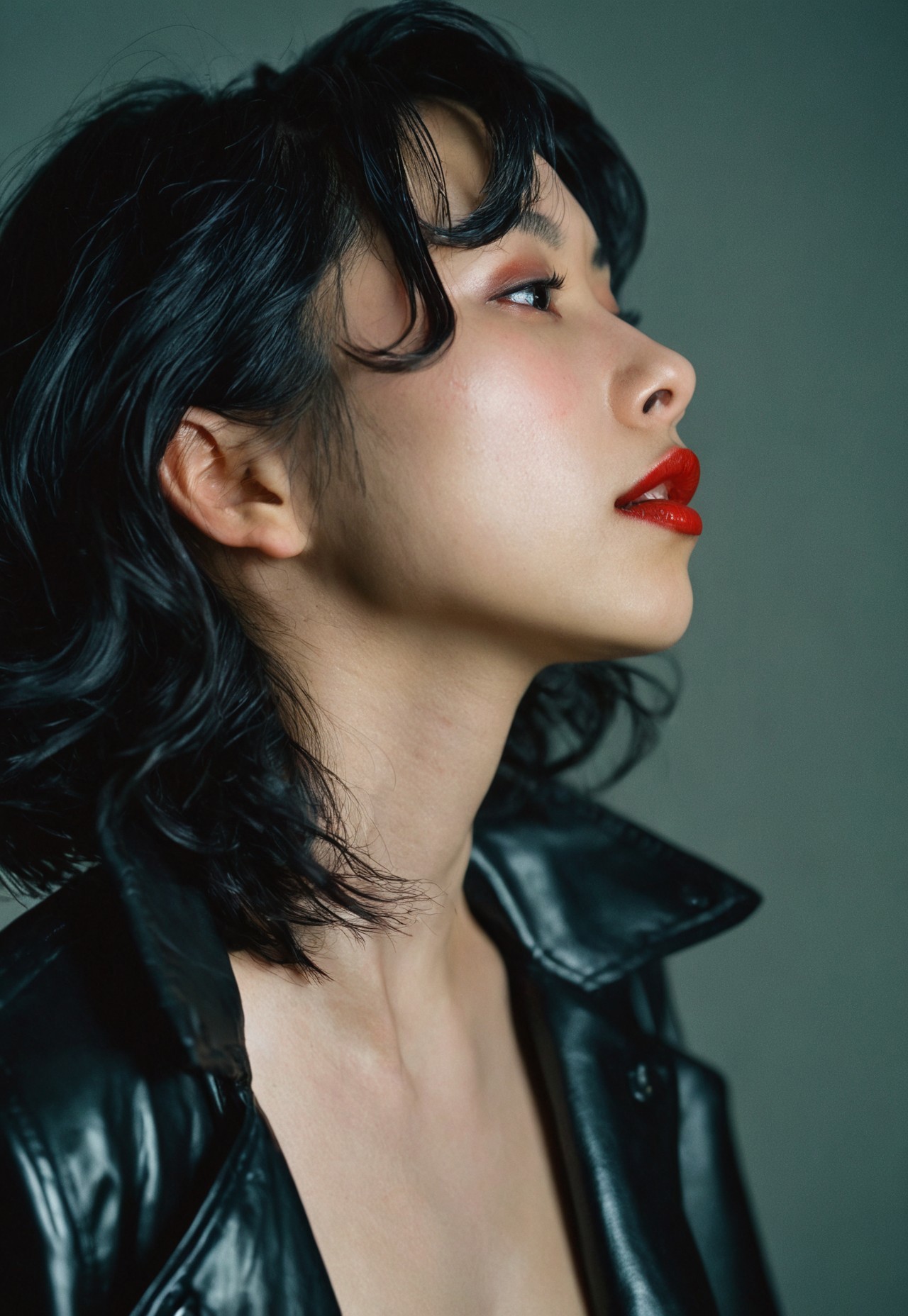 shot on Nikon F3, Close-up portrait, 28 years old badass looking slim japanese girl, side view, sharp jawline, black wavy short hair, pale glowing skin, deep red lipstick, wearing black leather jacket, soft highlights, soft natural lighting, dim dark-ish background, Superia Xtra 400 Film, film emulation, 35mm film, grainy, fIlm grain, halation, Bloom, high dynamic range, film photography, 23mm focal length, iso 100, f/2.8, (sharp details, high quality, 4k, intricate details, highly-detailed)