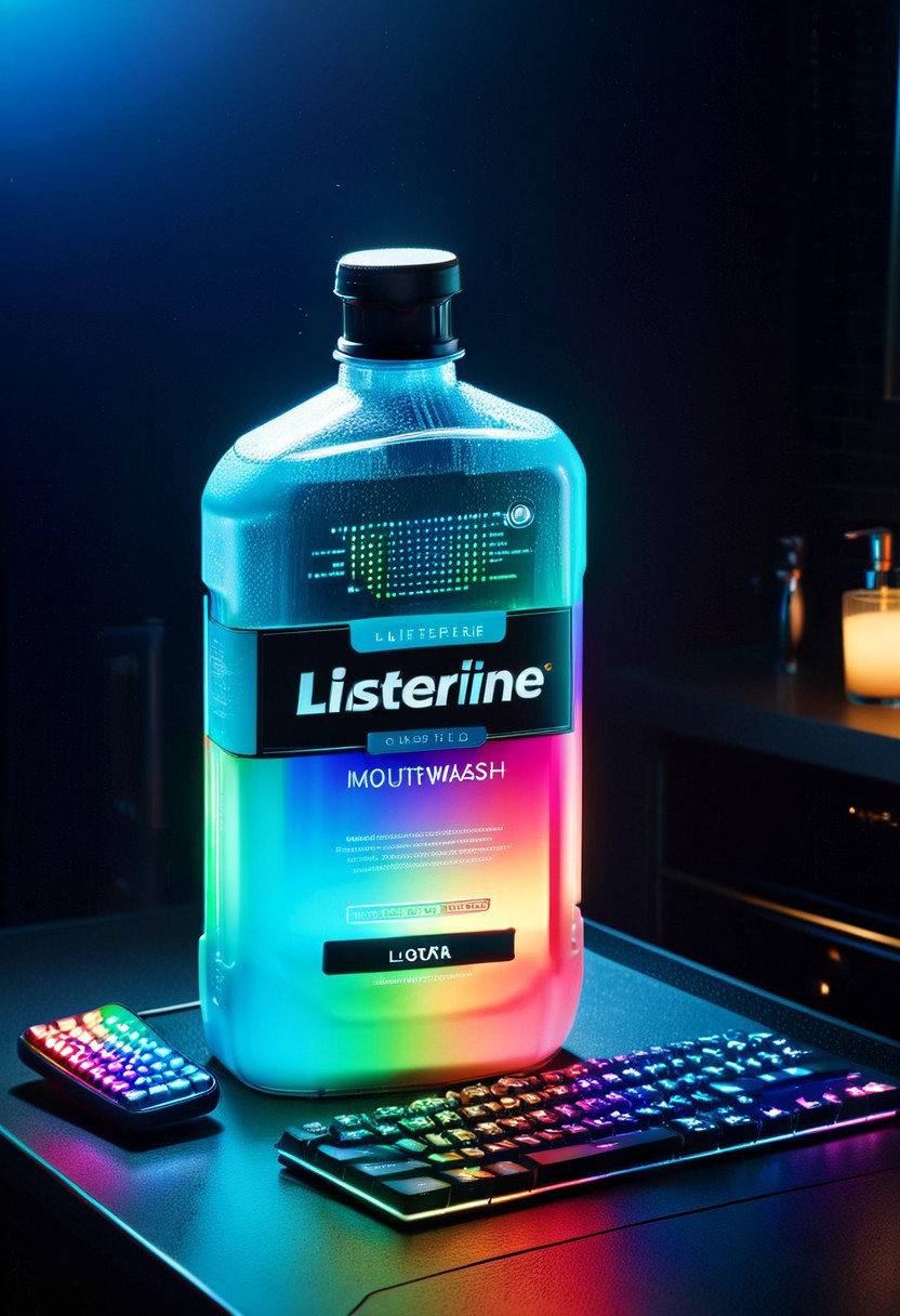 (((reality-shot, realism, realistic photography of a Listerine mouthwash bottle transformed into an RGB masterpiece, translucent liquid inside glowing with shifting rainbow hues, label redesigned with illuminated keyboard keycaps cycling through vibrant colors, cap emitting a soft LED pulse synchronized with the liquid's glow, bathroom counter reflecting cascading chromatic reflections, modern art style, electric-blue theme, intricate details, ultra sharp, exquisite detail, flawless composition, vivid colors, masterpiece, futuristic hygiene lora:rgb_keyboard_morph:1)))