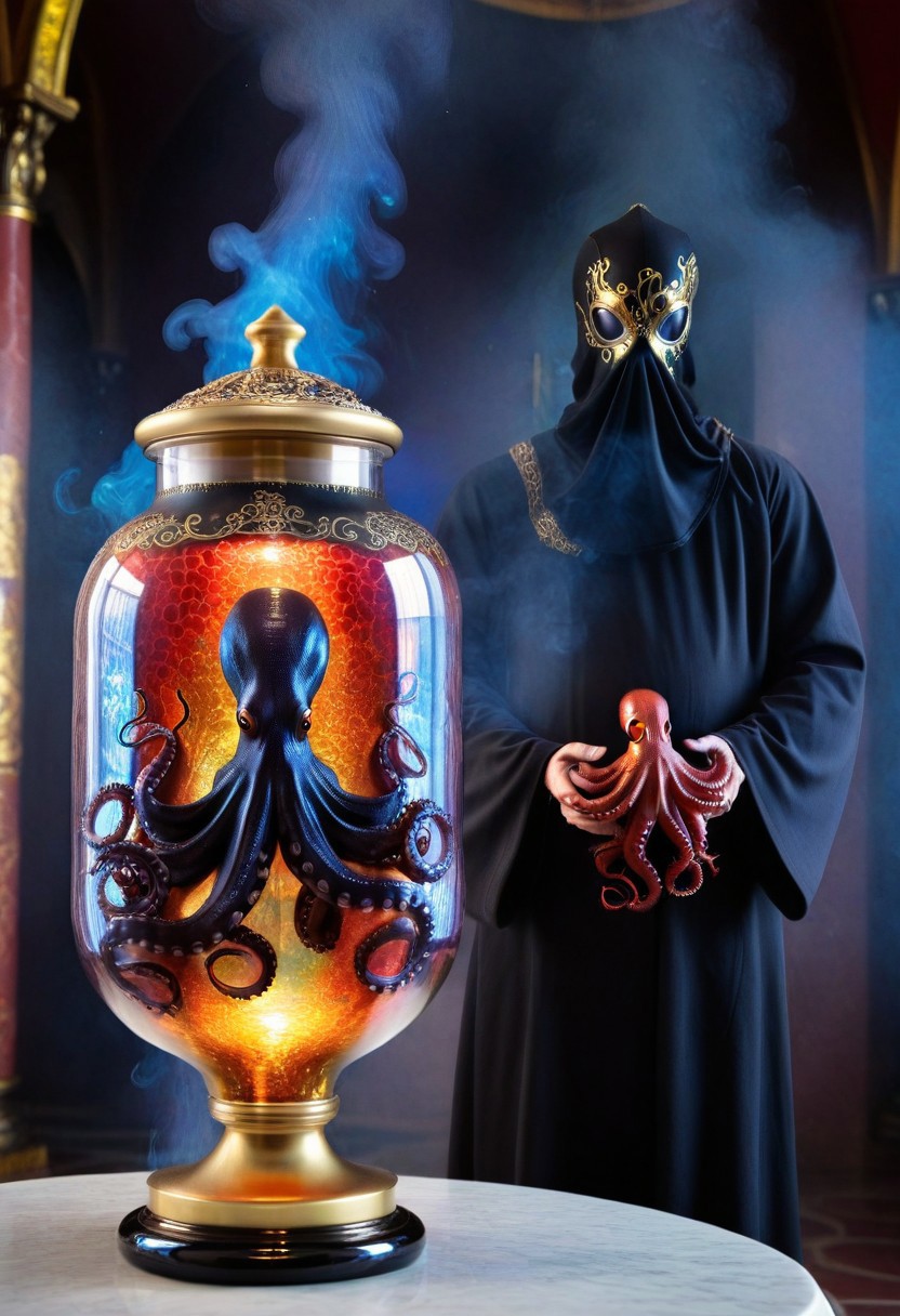 holography "THE OCTOPUS" black gold masterpiece, best quality, solo, masked:1.2 1man, standing at an altar, black smoke, holding a red octopus in a large glass jar