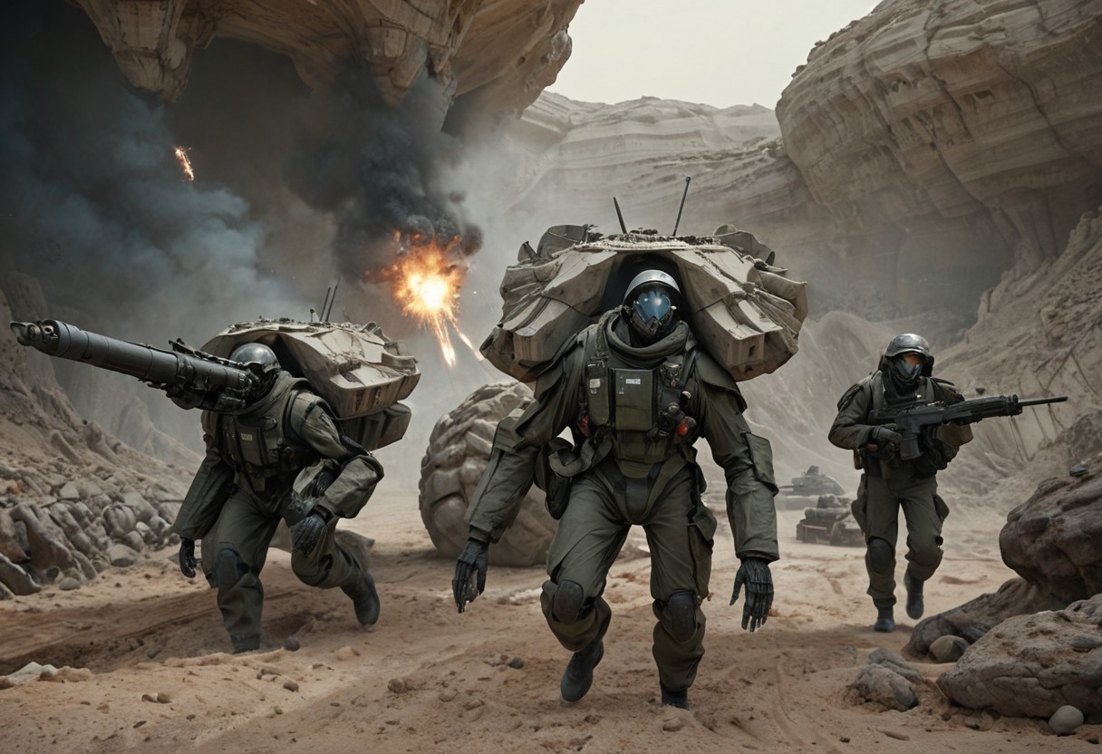 artillery fire, soldiers taking cover, explosions in the background, Battlefield, war on desert rocky planet, ((marching)), three quarters view, Stone catacombs in an alien world . Alien stone military tank, fissures on skin ((((Full body portrait))))