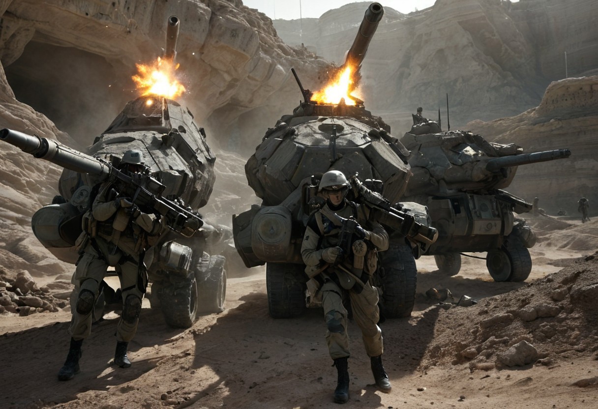 artillery fire, soldiers taking cover, explosions in the background, Battlefield, war on desert rocky planet, ((marching)), three quarters view, Stone catacombs in an alien world . Alien stone military tank, fissures on skin ((((Full body portrait))))