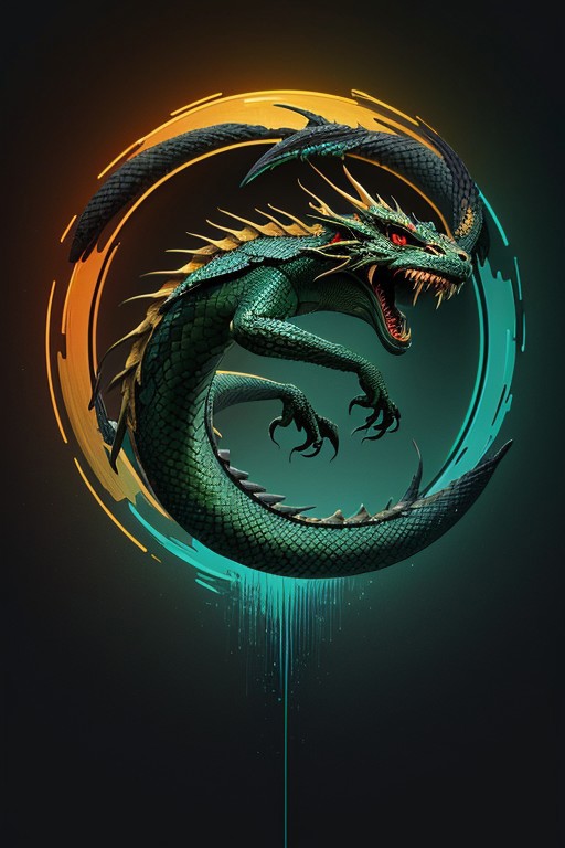 Asian dragon , green, red, gold snake gradient vibrant neon colour, rough, textural, broad brush strokes, red color prominent detailed, alienzkin, silhouette, spotlight, dark theme, c4d, blender, raytracing, unreal engine 5, render 3d