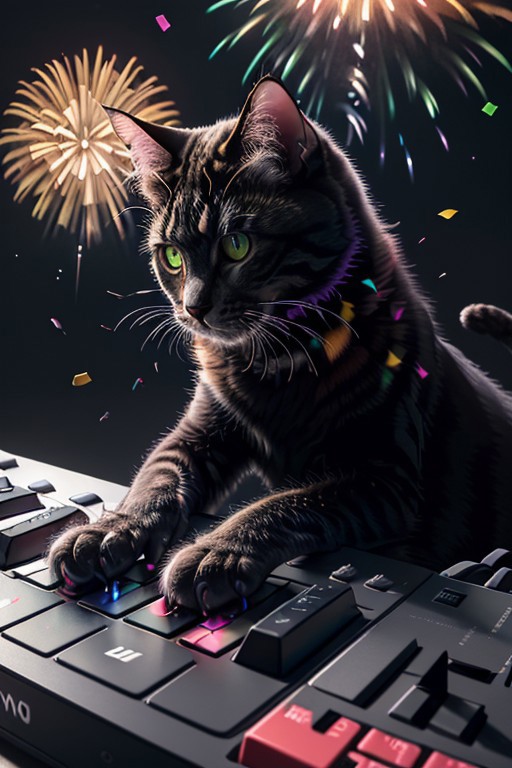 (masterpiece:1.2), (best quality:1.2), highly detailed, realistic texture, sharp details, extremely delicate and beautiful, realistic cg 8k wallpaper Cat DJ with RGB paws, spinning tunes with keyboards, confetti and fireworks <lora:add-detail-xl:3> <lora:RGB_Keyboard_themed:1>