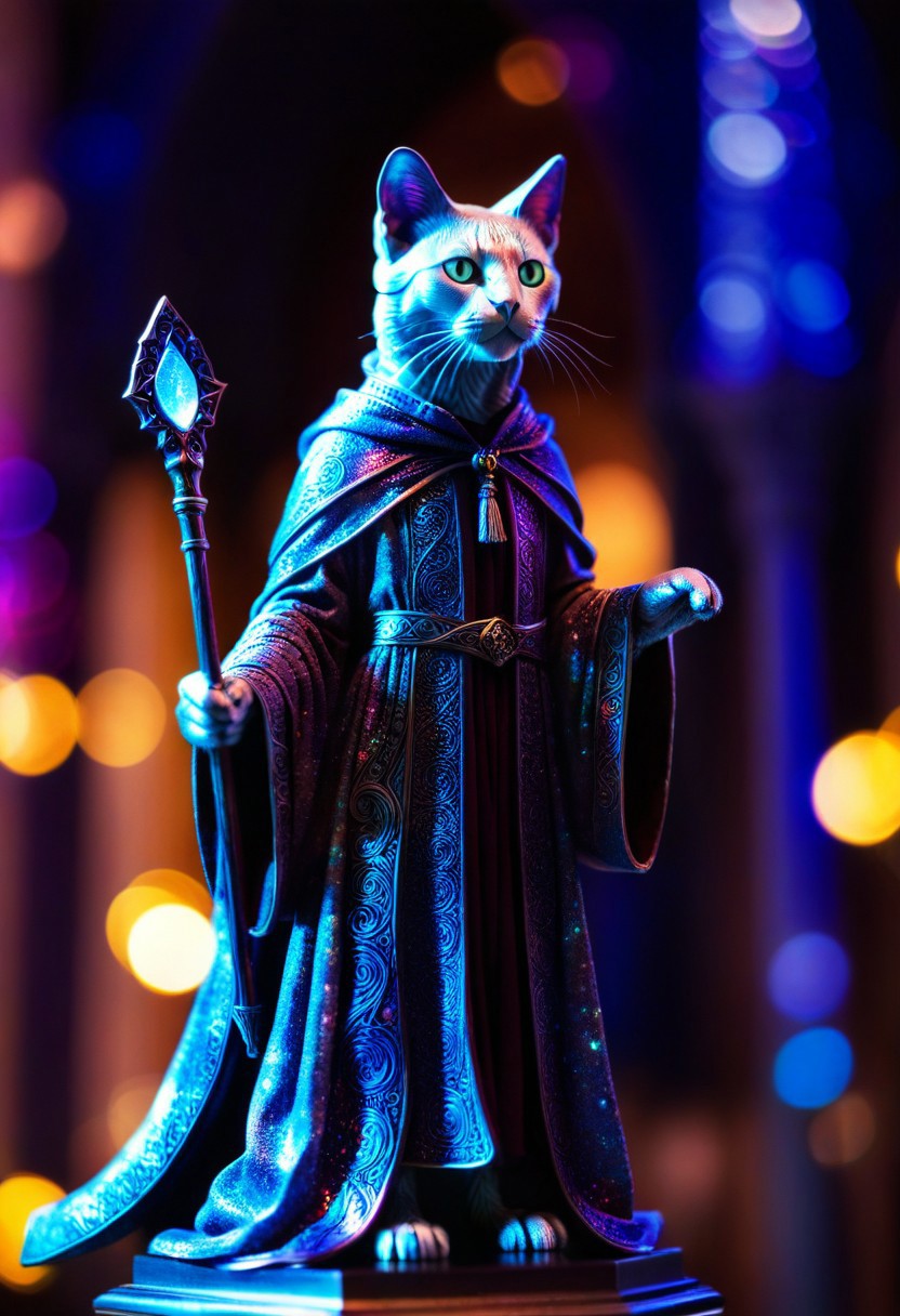 masterpiece,ultra-high resolution,incredible composition,extremely detailed, masterpiece, extremely detailed, sharp outlines, high contrast, fine details, intricate, photo of a sculpture of a Holography cat dressed as a wizard, mage robes, staff, intricate background, bokeh, inspiring, moody lights, neoclassical art style,