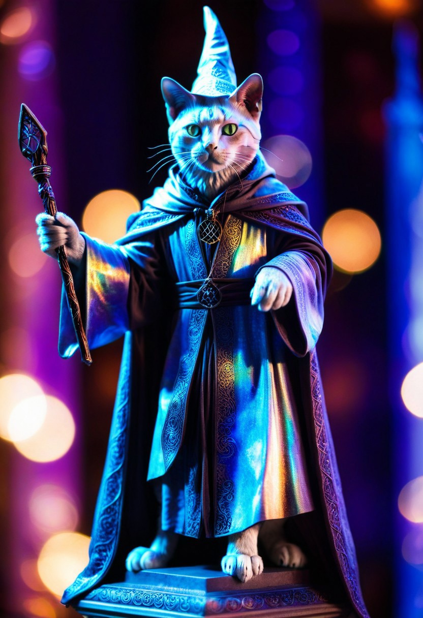 masterpiece,ultra-high resolution,incredible composition,extremely detailed, masterpiece, extremely detailed, sharp outlines, high contrast, fine details, intricate, photo of a sculpture of a Holography cat dressed as a wizard, mage robes, staff, intricate background, bokeh, inspiring, moody lights, neoclassical art style,