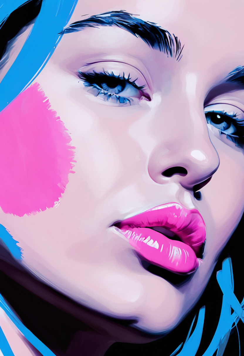 digital painting, realistic illustration, pastel strokes, clean digital portrait sketch, very close up of a female model, plump lips, beautiful woman, minimal smidge strokes by hand, colors pink blue and black, contrast(no other color)