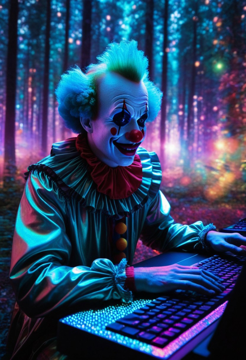 masterpiece, extremely detailed, sharp outlines, high contrast, fine details, intricate, Holography clown at computer, forest, intricate background, bokeh, inspiring, moody lights, digital magic dust enchantment. neoclassical art style, Made of enchantment music made out of iridescent