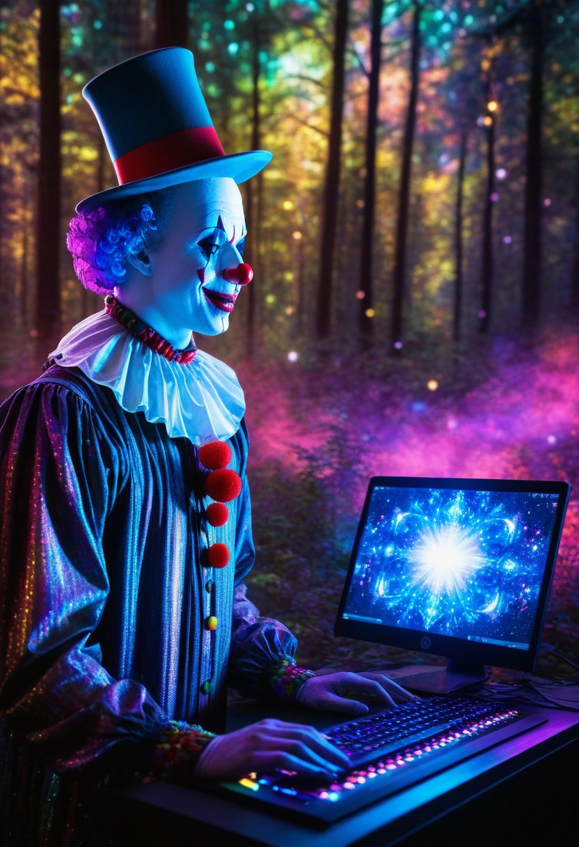 masterpiece, extremely detailed, sharp outlines, high contrast, fine details, intricate, Holography clown at computer, forest, intricate background, bokeh, inspiring, moody lights, digital magic dust enchantment. neoclassical art style, Made of enchantment music made out of iridescent