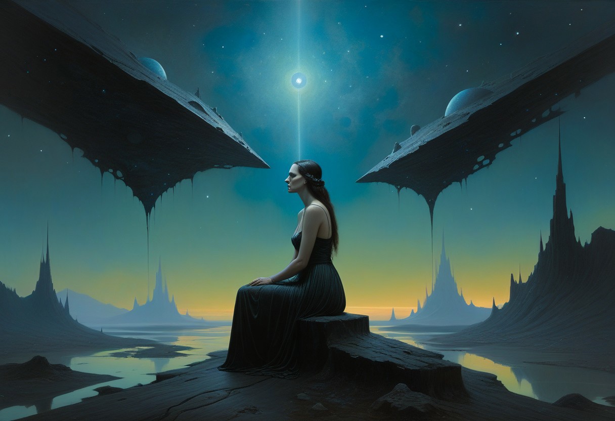 lacrimae et dolor, abstraction, regret sorrow, by Stalenhag, by Brom, surreal, labradorite, black jet, and opal, the far stars deny us hope, tears from the galactic rift far above