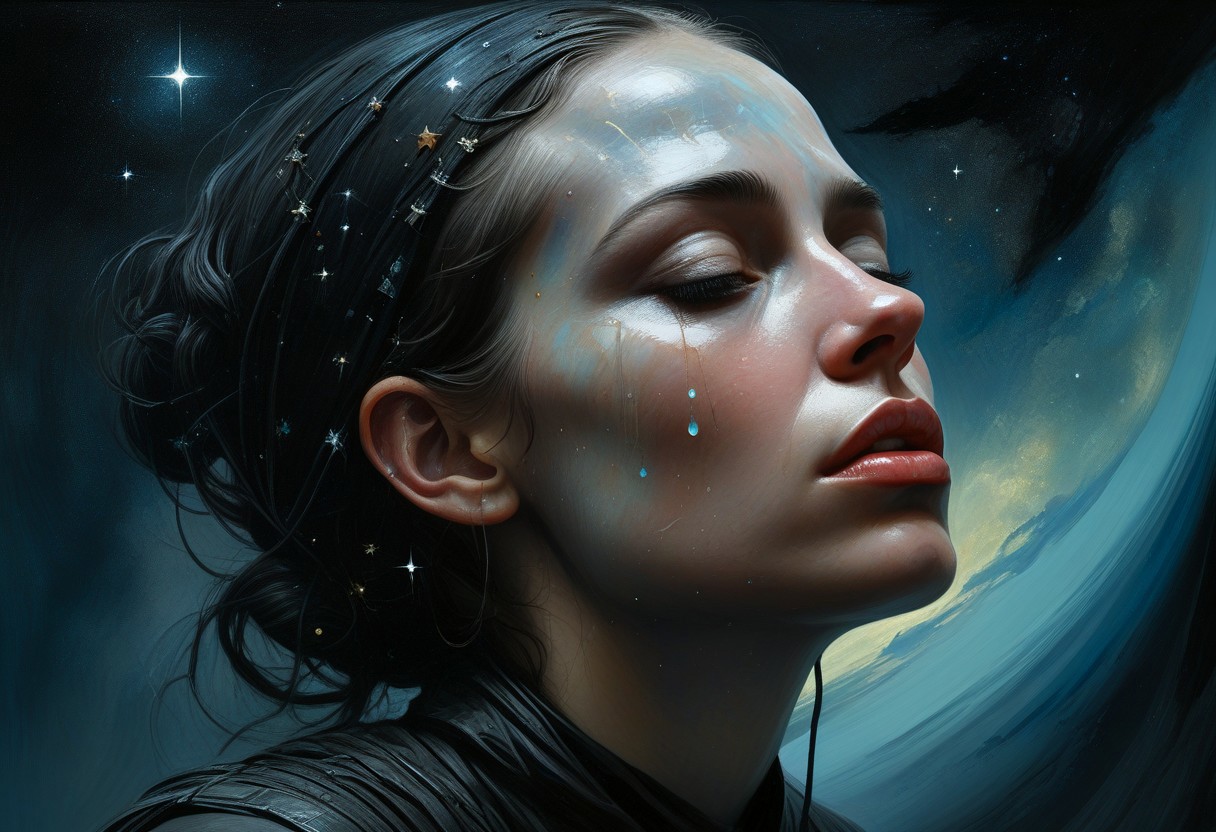 lacrimae et dolor, abstraction, regret sorrow, by Stalenhag, by Rutkowski, surreal, labradorite, black jet, and opal, the far stars deny us hope, tears from the galactic rift far above, extremely high-resolution details, photographic, abstract expressionism, detailed painting, graphic novel, 1930s black renaissance
