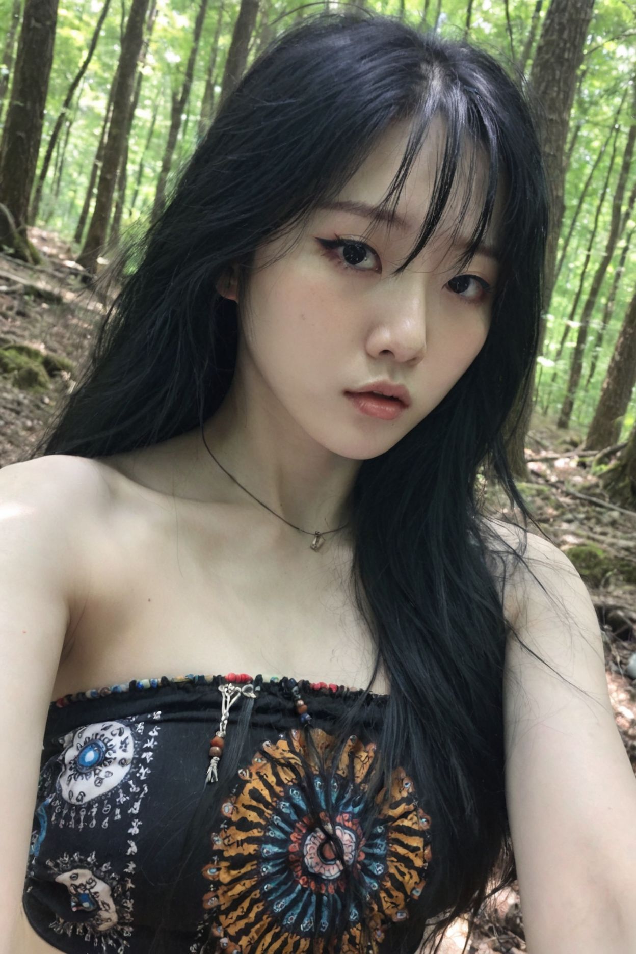 1girl,Korean,pale skin,sexy face,beautiful,black tube top,medium breasts,long black hair,wearing hippie clothing,boho style,background forest,chaotic selfie,ig baddie,natural lighting,intricate details,hyper realistic,noisy image,blurry,<lora:real-humans-PublicPrompts:0.2>