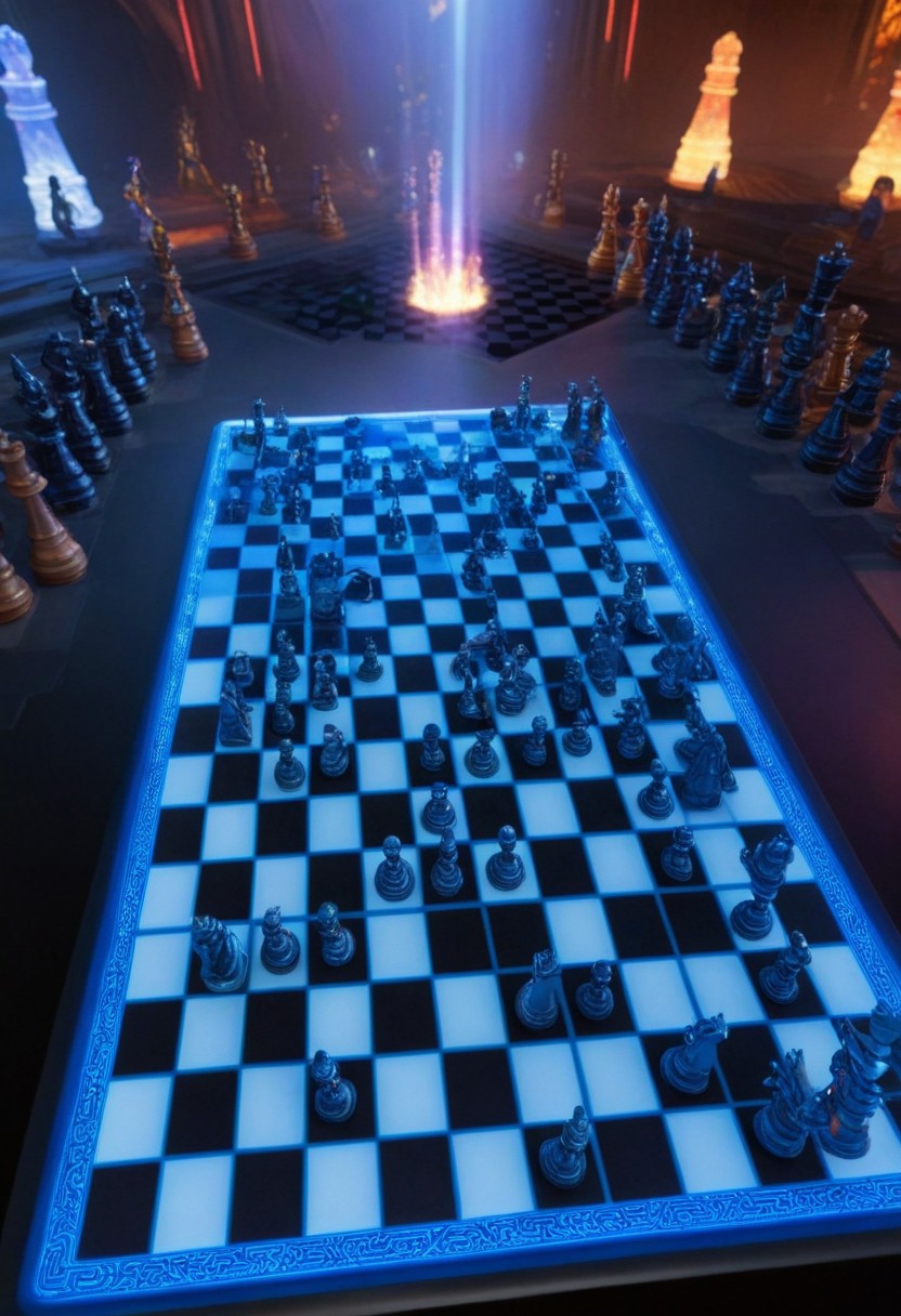 score_9, score_8_up, score_8_up, masterpiece,super detailed face, super high resolution, masterpiece-level, highly detailed, intricate details, detailed background, complex background, cinematic, intricately detailed illustration, depth of field, masterpiece, best quality, amazing quality, very aesthetic, absurdres, newest, very awa, shadow, dynamic angle, holographic board, interactive interface, augmented reality (AR), virtual reality (VR), real-time tracking, 3D animated battles, voice commands, multiplayer mode, AI opponent with personality, haptic feedback, customizable avatars, dynamic stats display, floating timers, spectator mode, portable setup, chess variants, character-based abilities, unique attack animations, faction-themed pieces (e.g., warriors, wizards, sci-fi units), special move effects, unlockable skins, lore-driven backstories, emotive reactions (taunts/celebrations), RPG-style progression, team synergies, environmental interactions, power-ups, cinematic checkmate sequences