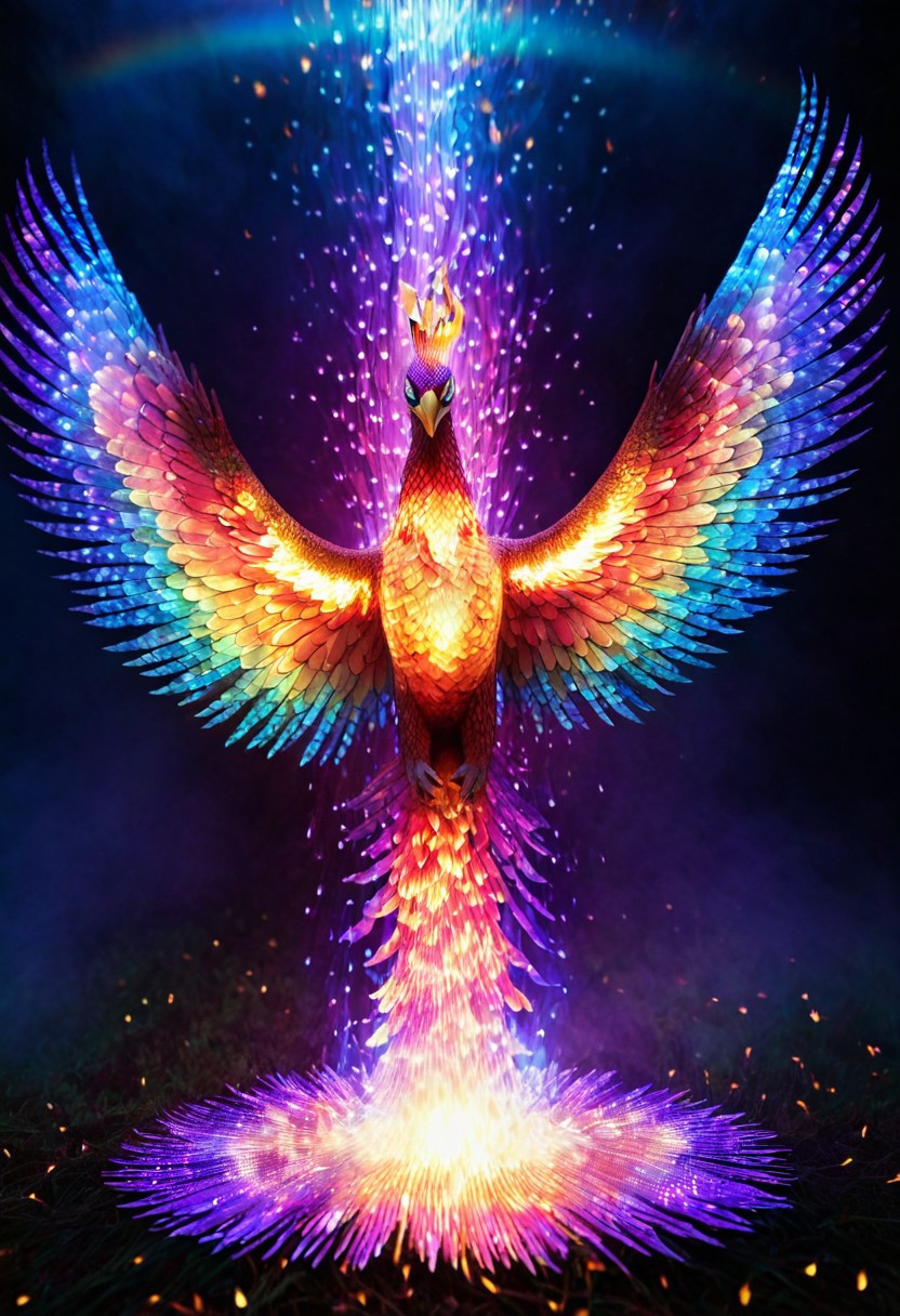 (((reality-shot, realism, realistic photography of a mythical phoenix rising from ashes made_from_h4v_h0l0, feathers formed by cascading holographic streams, eyes glowing like twin LED displays cycling through hues, flames licking at its form replaced by radiant pixelated fire, rebirth-themed art style, fiery-rainbow theme, intricate details, ultra sharp, exquisite detail, flawless composition, vivid colors, masterpiece, eternal renewal lora:holography_world_morph:1 )))