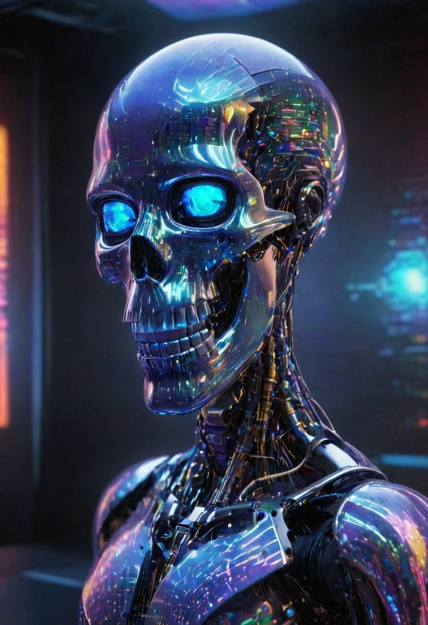 A highly detailed CGI image of a holographic blue-robot with glowing h4v_h0l0. The robot has a large, smiling blue face with big, expressive eyes and a small, open mouth, giving it a friendly appearance, circuit-like patterns on its forehead. female robot entirely made of h4v_h0l0, featuring gold accents on the eye sockets and nose. The skull wears a vivid blue h4v_h0l0 suit jacket with a glossy finish, and a tie also constructed from h4v_h0l0. The design blends surreal and artistic elements, combining android and human traits with precision. The skull’s lips are closed, forming a calm, neutral expression. The background is a soft, sparkly gradient of red and green hues, giving the image a luminous, dreamlike feel. The skull has a smooth, polished surface, and the lighting is carefully arranged to highlight both the intricate keyboard structure and the reflective jacket. The composition is well-balanced and focused on the upper torso and skull, emphasizing artistic foreshortening and chromatic detail, in the style of contemporary light-based art installations, smoke h4v_h0l0 datacenter background. holographic blue-robot with glowing h4v_h0l0, android skull made of h4v_h0l0 with gold eye sockets and nose, blue h4v_h0l0 glossy suit jacket, h4v_h0l0 tie, soft sparkly pink h4v_h0l0 gradient background, polished textures, surreal and artistic CGI, neutral expression, foreshortening art, smoke h4v_h0l0 datacenter background