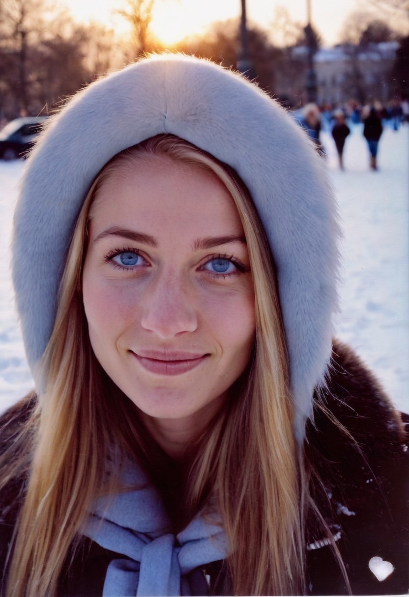 polaroid picture,frames picture, caught in the act smirk, amateur analog photo, candid photo, Authentic share, amateur quality phone photo in bad resolution, beautiful,grainy picture, faded colors, underexposed picture,polaroid photo, grainy, amateur photo a crooked thumbtack holds the top of the photo, dog-eared photo, 1 swedish girl,3/4 front:1.3, portrait, pale skin:0.2, straight long hair,classical straight haircut, stunning beautiful face, model face, realistic skin, ((realistic light blue eyes:1.3)),((realistic pupills)), fur hood on head, outdoor, parc,snowy day,golden hour, blury people in foreground, speed effect on people