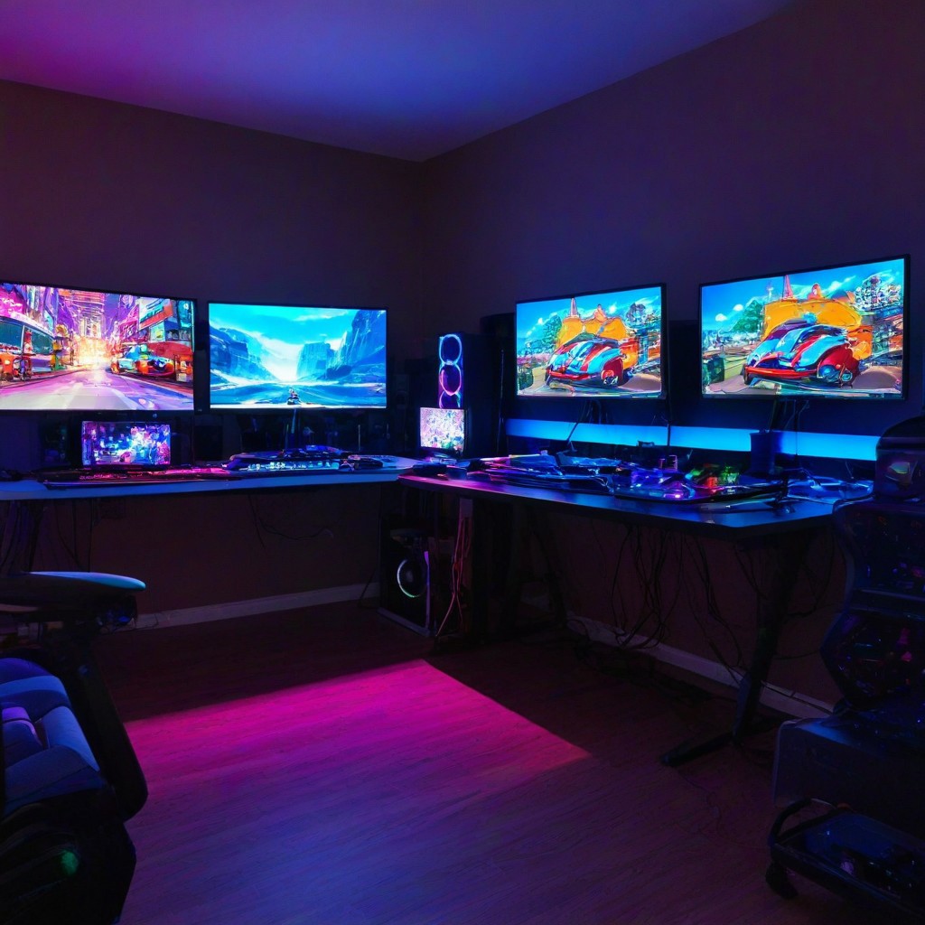 Score_9, Score_8, score_8_up, score_7_up, score_7, a dimmed picture of an empty gaming room that is very vibrant. It has a monitor and gaming console. There are multiple colorful computers and colorful consoles. It is very vibrant and colorful