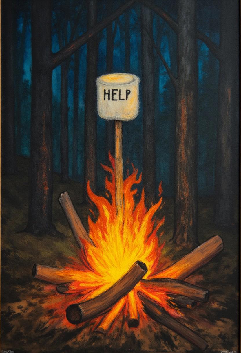 k3c4 style art photo, a Nintendo-Switch, stuck in a tree branch, is being blasted over a campfire like a marshmallow. The word "HELP" is on its screen.