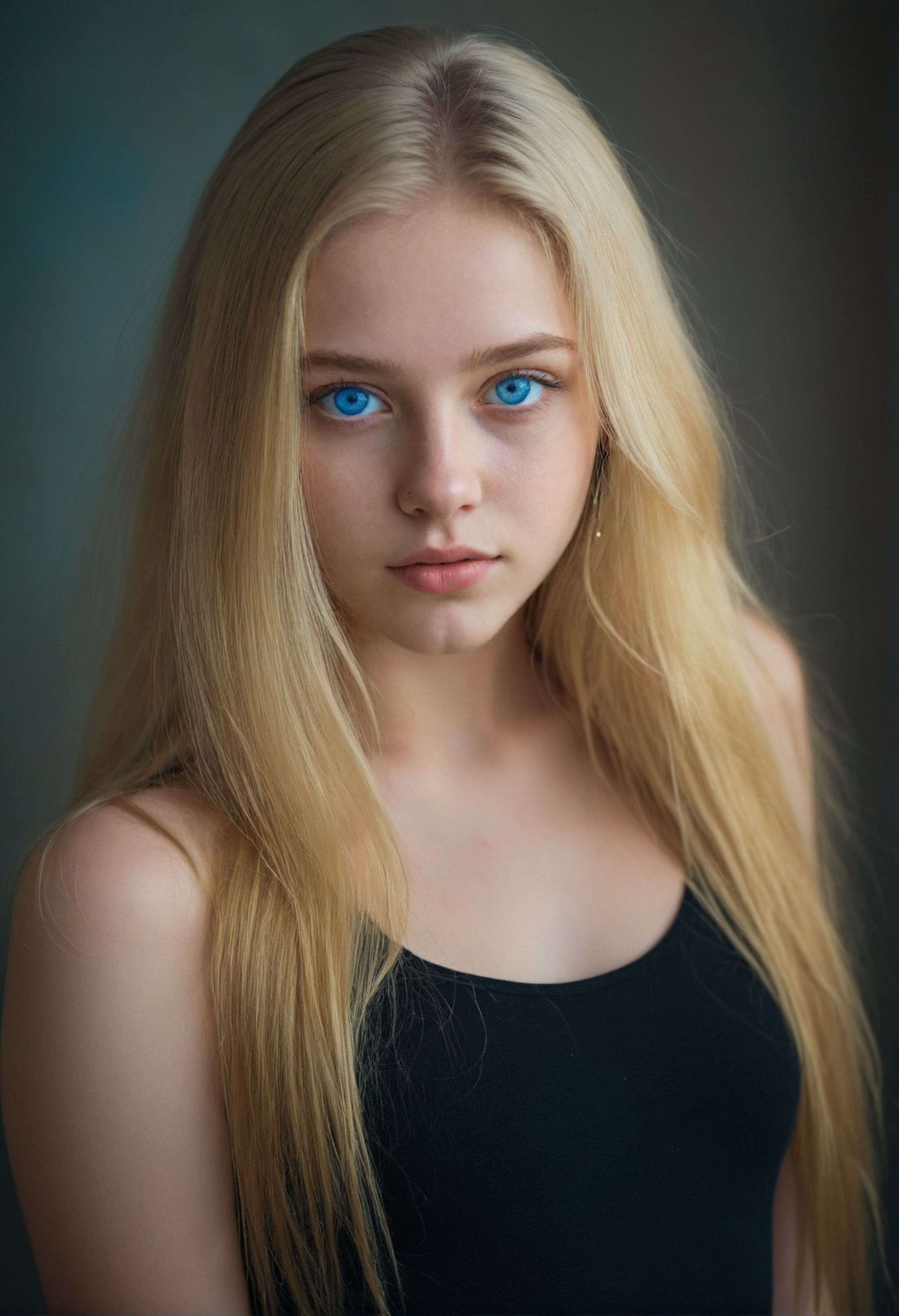 A beautiful portrait of a young woman ((full body)) with fair skin, long blonde hair and piercing blue eyes. She is 20 years old and exudes a confident and seductive aura. The background is a subtle mix of warm and cool tones, creating a depth effect that emphasizes the beauty of the person portrayed. The lighting is soft and natural, with a golden glow illuminating her face., portrait photography
