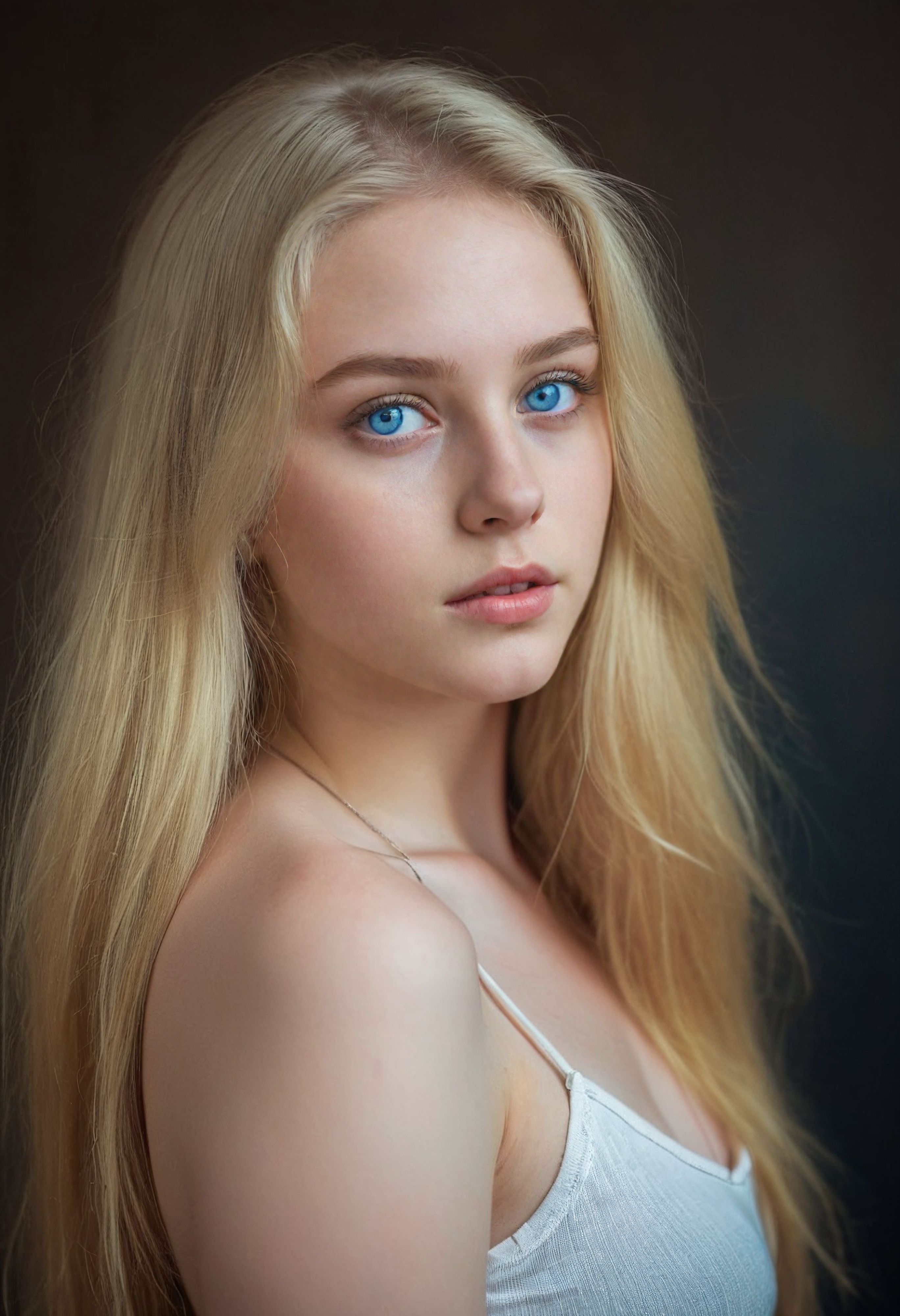 A beautiful portrait of a young woman ((full body)) with fair skin, long blonde hair and piercing blue eyes. She is 20 years old and exudes a confident and seductive aura. The background is a subtle mix of warm and cool tones, creating a depth effect that emphasizes the beauty of the person portrayed. The lighting is soft and natural, with a golden glow illuminating her face., portrait photography