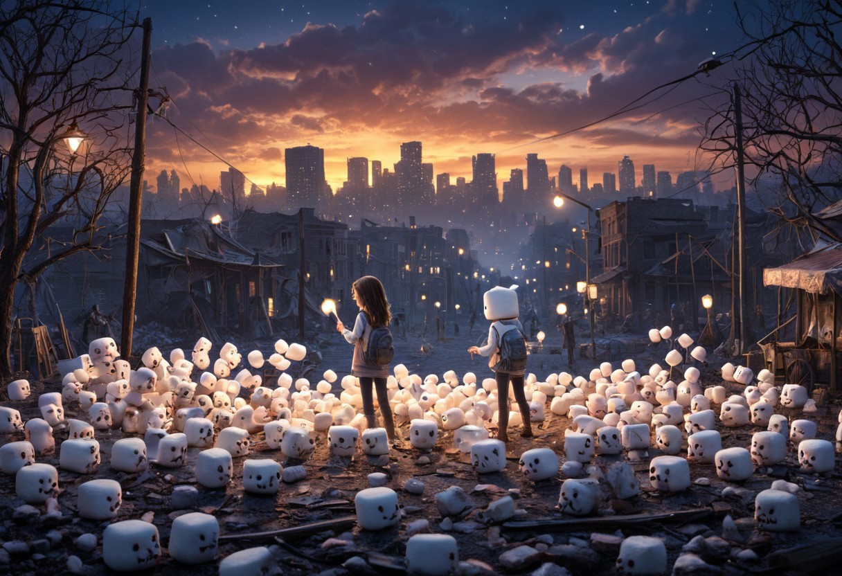 SFW, PG-Rating, high detail, high quality, dramatic lighting, cinematic lighting, detailed background, masterpiece, detailed masterpiece, best quality, Graphic details, perfect design, the softest marshmallow zombies, post-apocalyptic, Ruined city, Dramatic poses, Night sky, illuminated by street lights, a girl fighting the Marshmallow zombies