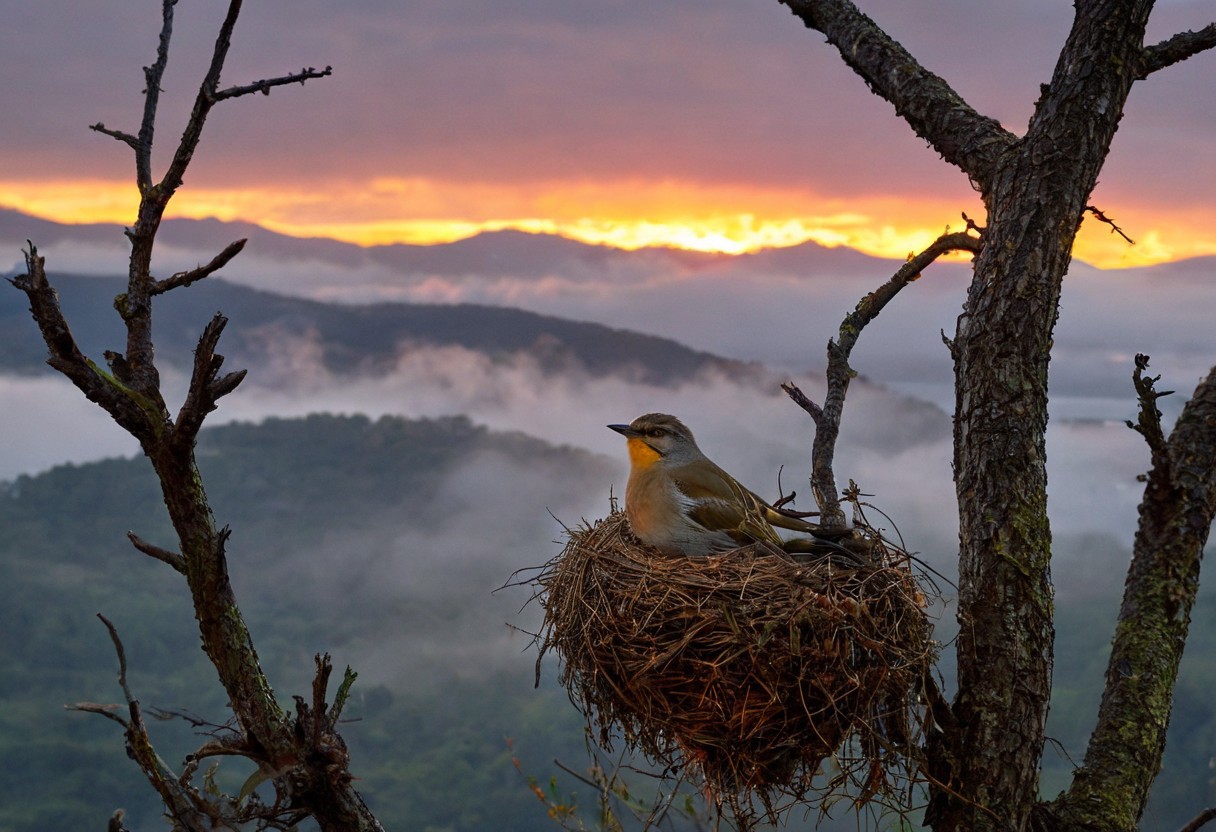score_9, score_8_up, score_7_up, realistic, realism, HD, perfect quality, 16k, very detailed, realistic lighting, photo, photorealistic, BREACK, smal bird is sitting in its nest on a tree, it is late dawn, red scy, coulorfull clouds, dense fog, lake and hill ind background,