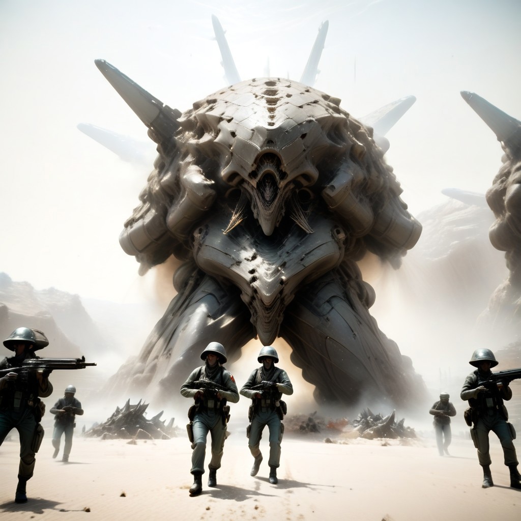 POV from a distance of the battlefield, Giant damaged flaming battleship in the sky, JJ Abrams style, Soldier armor off-gassing, Some soldiers cheering in the background, A soldier doing hero pose, Alien like structures in the background, organic alien structures in the background, artillery fire, soldiers taking cover, explosions in the background, Battlefield, war on desert rocky planet, ((marching)), three quarters view, Stone catacombs in an alien world . Alien stone military tank, fissures on skin ((((Full body portrait))))