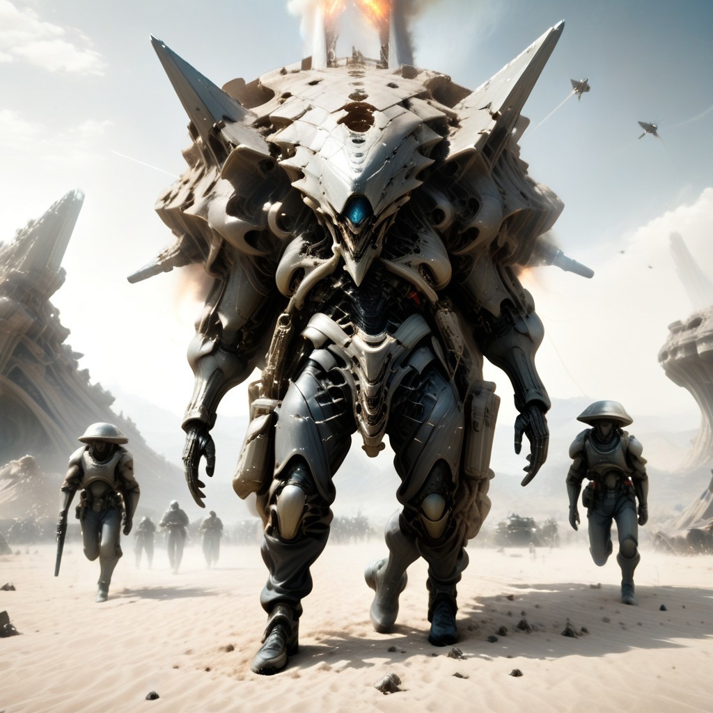 POV from a distance of the battlefield, Giant damaged flaming battleship in the sky, JJ Abrams style, Soldier armor off-gassing, Some soldiers cheering in the background, A soldier doing hero pose, Alien like structures in the background, organic alien structures in the background, artillery fire, soldiers taking cover, explosions in the background, Battlefield, war on desert rocky planet, ((marching)), three quarters view, Stone catacombs in an alien world . Alien stone military tank, fissures on skin ((((Full body portrait))))
