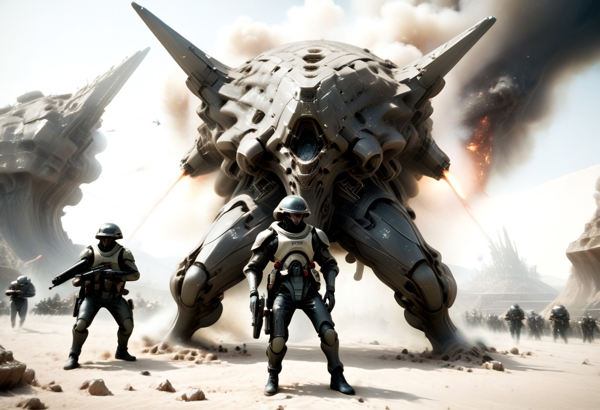 Giant battleship in air on fire, JJ Abrams style, Soldier armor off-gassing, Some soldiers cheering in the background, A soldier doing hero pose, Alien like structures in the background, organic alien structures in the background, artillery fire, soldiers taking cover, explosions in the background, Battlefield, war on desert rocky planet, ((marching)), three quarters view, Stone catacombs in an alien world . Alien stone military tank, fissures on skin ((((Full body portrait))))