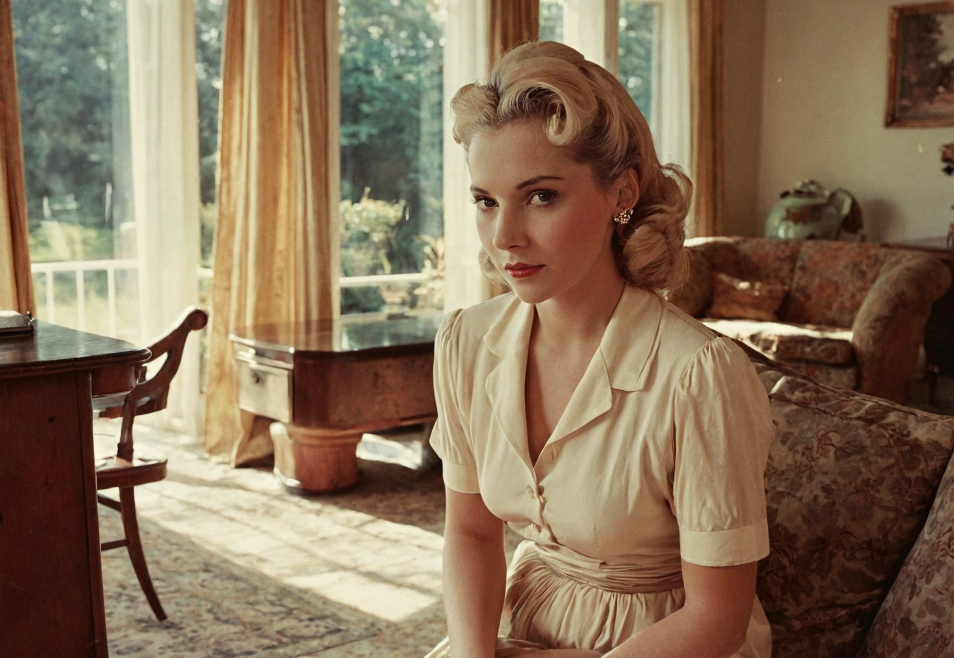 1950's Panasonic style, vintage color photograph of beautiful blonde woman, 30 years old, sitting in an elegant living room, 1940's aesthetic, sun shining in windows and throughout room, warm golden hour light