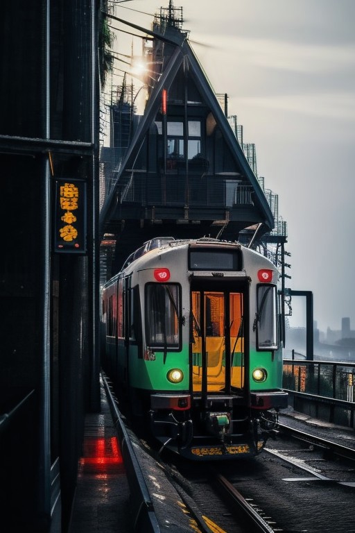 neon city, spotlight, flying train,