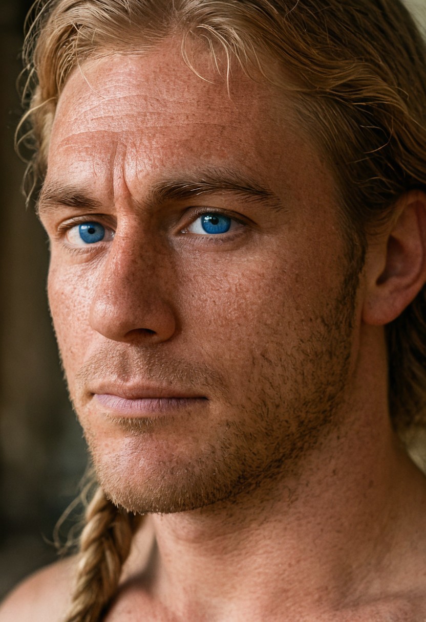 clportrait of a handsome Viking man with a long braided blond hair, reddish stubble, subtle wrinkles around the eyes, visible pores and skin texture, sunburnt skin, warm ambient light, natural expression, high-resolution DSLR photo, shallow depth of field, soft shadows, realistic skin detail, (PhotorealTouch_v1:0.85), striking blue eyes