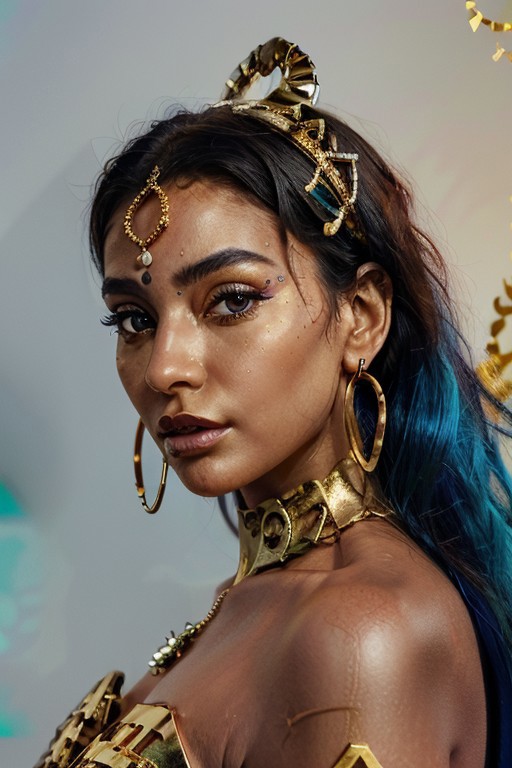 Imagine a hyper-detailed portrait of a woman with azure red skin, her face decorated with gold tribal patterns that swirl and curve around her eyes, cheeks, and neck. The golden motifs are complex, with lines, dots, and spirals that add texture and depth to her visage. Her lips are painted with a deep metallic color that harmonizes with the golden details on her skin. She wears a prominent headdress of silver, adorned with dangling ornaments that add movement and contrast to the stillness of her face. Large, elegant gold hoop earrings complement the tribal-inspired design, and her eyes are framed with dramatic golden eye shadow and long, defined lashes. The lighting is soft yet focused, highlighting the gold’s shimmer and the matte finish of her blue skin, lending a realistic touch to this ethereal composition. This photorealistic image fuses ancient cultural elements with a modern style, creating a mesmerizing effect, front view, from below,