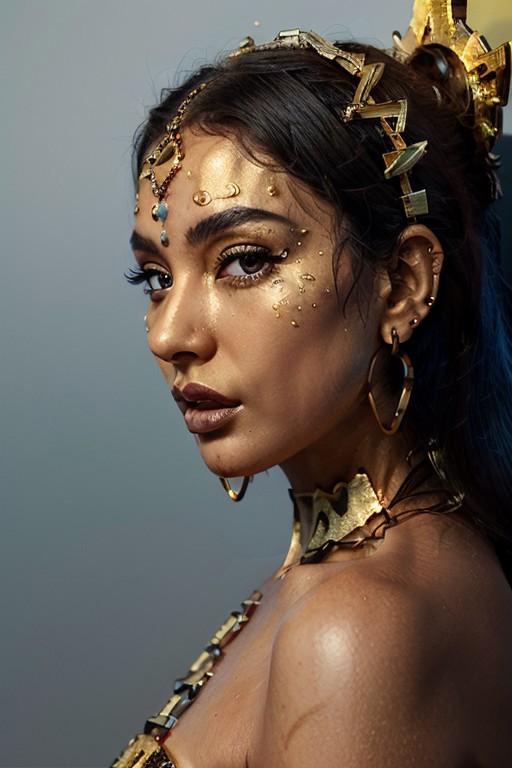 Imagine a hyper-detailed portrait of a woman with azure red skin, her face decorated with gold tribal patterns that swirl and curve around her eyes, cheeks, and neck. The golden motifs are complex, with lines, dots, and spirals that add texture and depth to her visage. Her lips are painted with a deep metallic color that harmonizes with the golden details on her skin. She wears a prominent headdress of silver, adorned with dangling ornaments that add movement and contrast to the stillness of her face. Large, elegant gold hoop earrings complement the tribal-inspired design, and her eyes are framed with dramatic golden eye shadow and long, defined lashes. The lighting is soft yet focused, highlighting the gold’s shimmer and the matte finish of her blue skin, lending a realistic touch to this ethereal composition. This photorealistic image fuses ancient cultural elements with a modern style, creating a mesmerizing effect, front view, from below,
