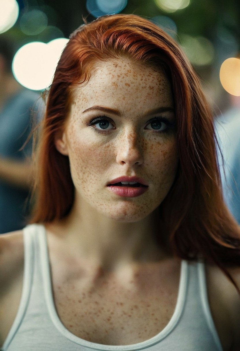 cinematic film still (Peripheral Visions:1.65), (art by Jean-Baptiste Huynh:1.6), (Lustful:1.5) A detailed Masterpiece, (((goosebump:1.2))), (((ultra-realistic-skin:1.5))), (ultra realistic bright eyes), (ultra realistic natural mouth),skinny girl, girl, 25 years old, black tank top, public place, natural face without any makeup. The skin appears as it is, with its real texture, smooth in some areas, with slight imperfections or redness. eyebrows are untouched, no defined shaping. eyelashes are unenhanced, whether short or long, with no mascara. natural color lips, without gloss or added pigment, long natural straight redhair,freckles:0.1 Highly Detailed, (Photorealism:1.3), detailed eyes, perfect eyes, cinematic lighting, Ektachrome, DOF, Shallow Focus, Retro-modern, Vintage-inspired with contemporary touches, (bokeh:1.3), (flash photography:1.6) blurry background. breathtaking, Masterpiece RAW photo of the most realistic photorealistic photo ever taken, shallow depth of field, vignette, highly detailed, high budget Hollywood film, cinemascope, moody, epic, gorgeous, film grain,