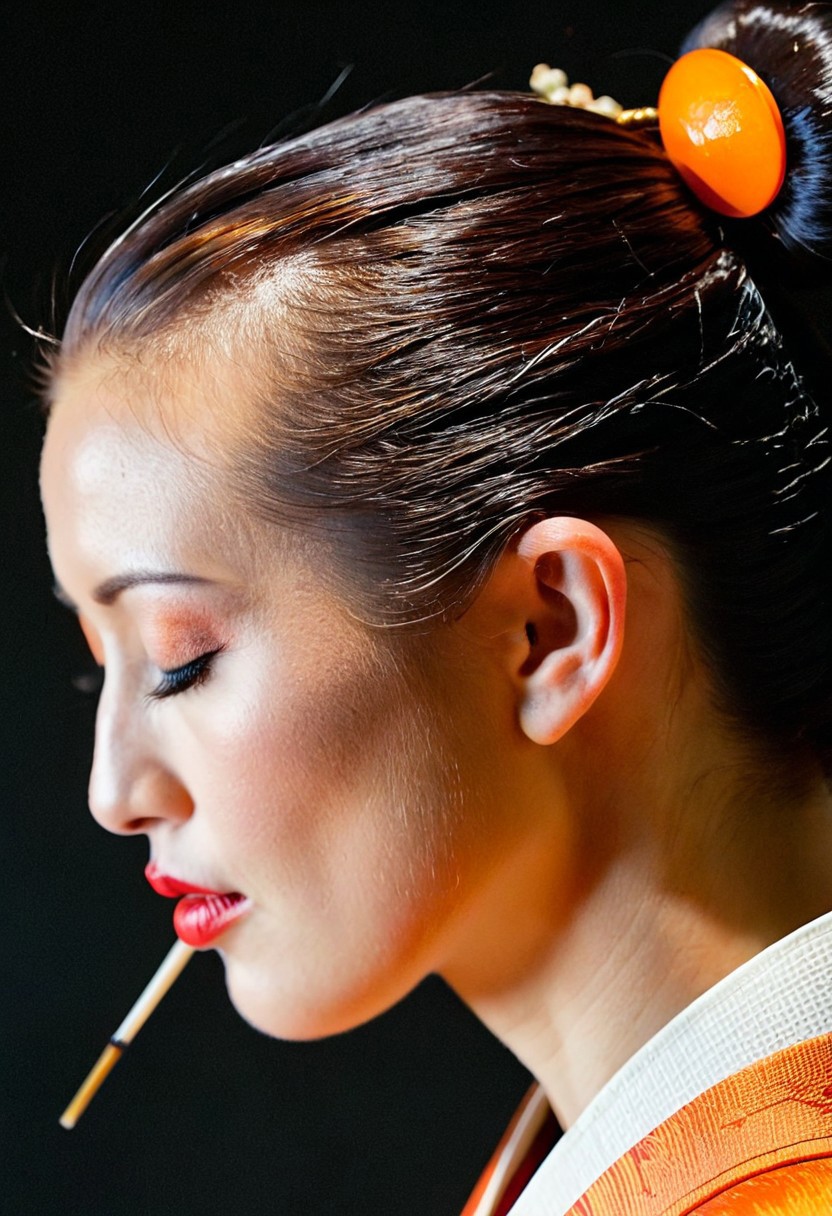 (masterpiece:1.5), best quality, amazing quality, very aesthetic, absurdres, newest, 8K, cinematic film still (Peripheral Visions:1.65), (art by Jean-Baptiste Huynh:1.6), (Lustful:1.5) A detailed Masterpiece, ((perfect bright-eyes-details:1.1)), ((perfect pupils-details:1.4)), ((perfect natural lips, mouth-details:1.4)), ((natural realistic-perfect-mouth:1.5)), goosebump, realistic eyes, realistic pale skin, ((pale skin:1.5)), profile view, 1 solo woman, 20 years old, natural beauty, geisha, japanese girl, hair pulled back, slicked back, strict bun, long pins crossed in the bun, she wears a richly decorated traditional Japanese kimono, her skin is very pale white, her lips made up ruby red, a thin black line of eyeliner, (dark orange circle and black background:1.5) Highly Detailed, (Photorealism:1.3), detailed eyes, perfect eyes, cinematic lighting, Ektachrome, DOF, Shallow Focus, Retro-modern, Vintage-inspired with contemporary touches, (flash photography:1.6) blurry background:1.5, blury foreground:0.1, breathtaking, Masterpiece RAW photo of the most realistic photorealistic photo ever taken, shallow depth of field, vignette, highly detailed, high budget Hollywood film, bokeh, cinemascope, moody, epic, gorgeous, film grain,