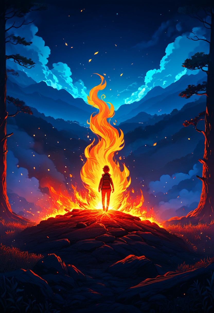 dreamscape Fire is a form of life, fire is born on purpose or completely unintentionally. Humans have heat, so does fire . Just like humans, fire needs food to live, grow and grow old, and one day fire will also wither and disappear. minimalist flat illustration, serene and surreal scene, Wide range of colors, Dramatic, Dynamic, Cinematic, Hand drawn flat art illustration, Flat Colour Anime, anime artwork, adventure, fantasy, manga-anime, whimsy, concept-art, (aerial shot, aesthetic, dreamy, vibrant, vivid), textural, artistic, anime style, key-visual, studio anime, beautiful, painterly, highly detailed, ultra-detailed, intricate details, absurdres, aid291, midjourneyv6.1, HavvoricFireDarkstyle