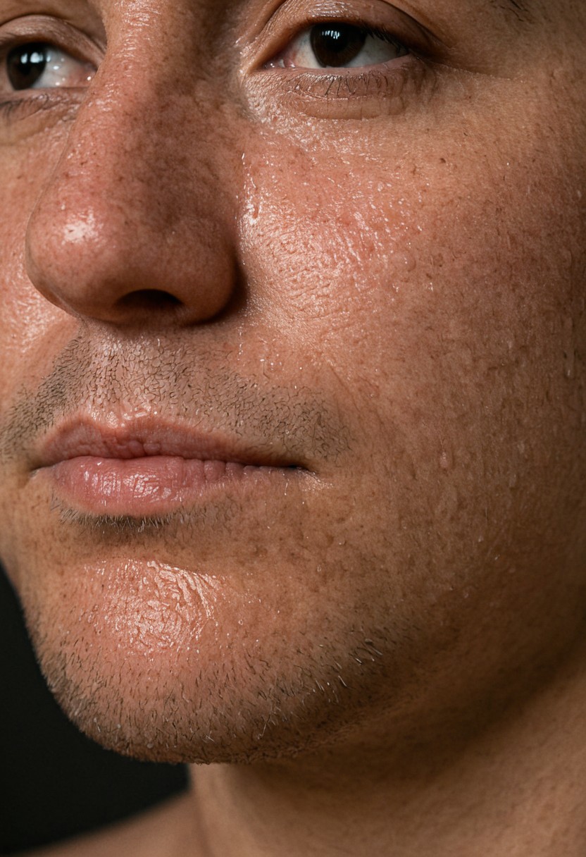extreme close-up portrait of a person under harsh direct lighting, strong skin contrast, visible pores, light facial hair, fine lines, realistic oiliness and texture, slightly sweaty skin, ultra high detail, (PhotorealTouch_v1:1.0)