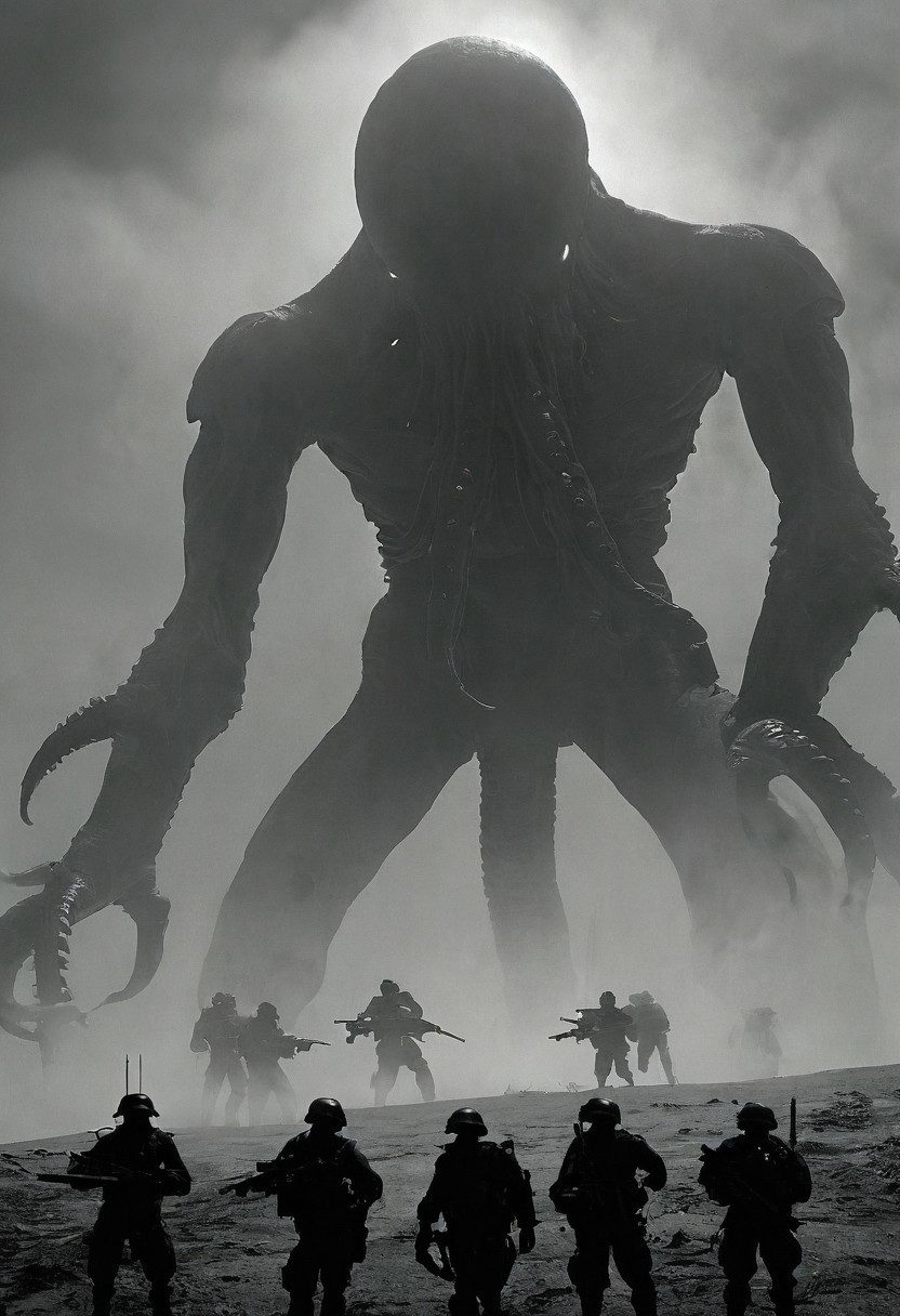 A monochromatic digital artwork depicts a massive cosmic horror entity hovering in a desolate, fog-shrouded landscape. The entity, rendered in stark silhouette, features writhing tentacle-like appendages extending outward from a bulbous central mass, towering over five armed military personnel in full combat gear positioned at the base of the scene. The entity fills the upper two-thirds of the frame against a misty background, while thin beams of light pierce through clouds to illuminate the scene from behind the creature. The soldiers stand in defensive positions, weapons raised, creating a clear size comparison to emphasize the entity's enormous scale. Black and white digital art with strong contrast lighting and atmospheric fog effects.