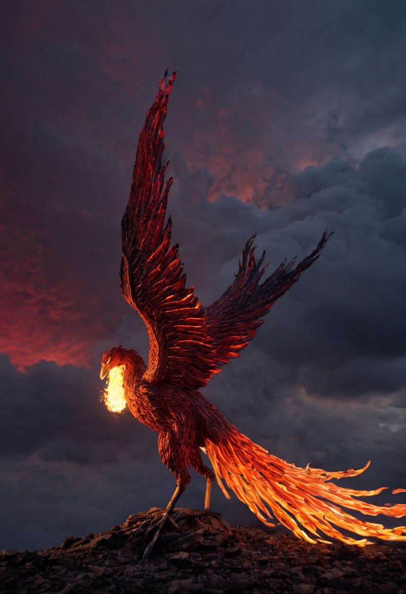 A product photo of a phoenix bird made out of ash and fire, the phoenix bird is red hot, and is soaring, in the sky, product photo, dark a gloomy sky, cloudy dusk, very early morning, professional. Outside with dim lighting, red lighting, red spot lighting, detailed, closeup, low-angle view. HavvoricFireDarkstyle, beautiful photo, dramatic, interesting, beautiful sunset